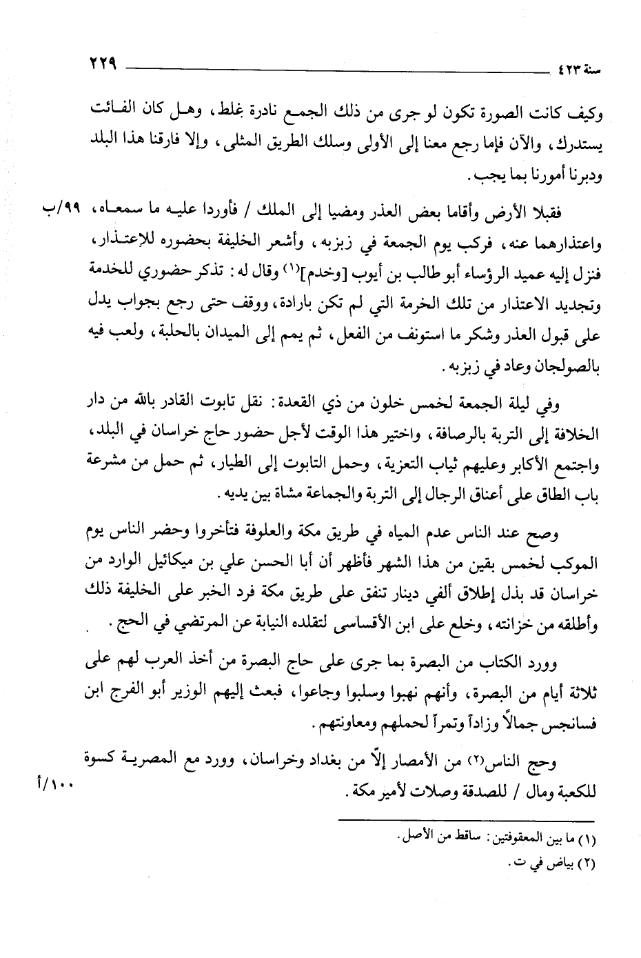 وورد الكتاب من البصرة بما جرى على حاج البصرة من أخذ العرب لهم على ثلاثة أيام من البصرة، وأنهم نهبوا وسلبوا وجاعوا، فبعث إليهم الوزير أبو الفرج ابن فسانجس جمالا وزادا وتمرا لحملهم ومعاونتهم.