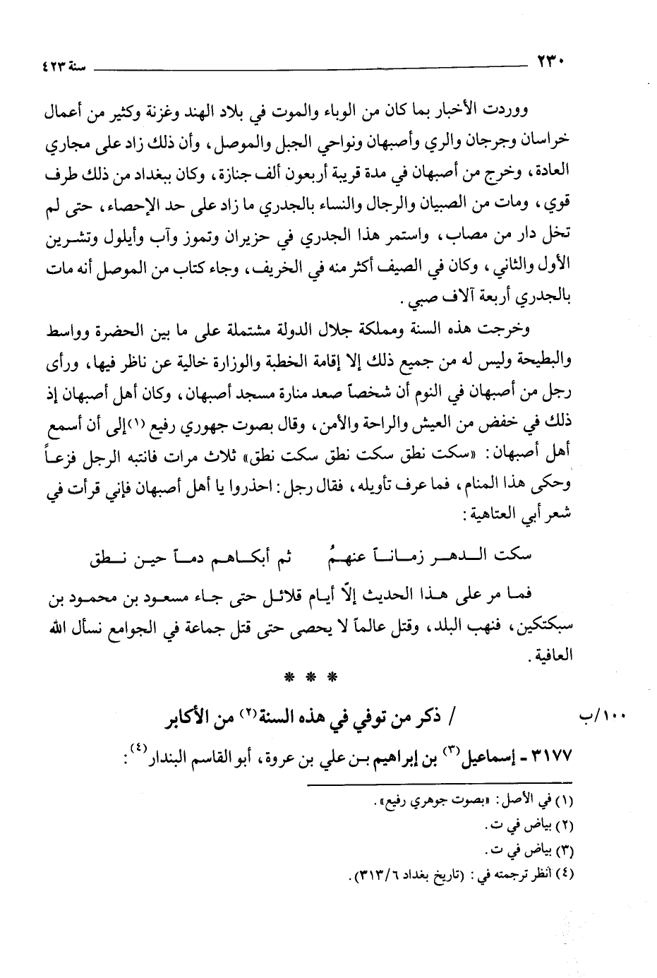 ووردت الأخبار بما كان من الوباء والموت في بلاد الهند وغزنة وكثير من أعمال خراسان وجرجان والري وإصبهان ونواحي الجبل والموصل، وأن ذلك زاد على مجاري العادة، وخرج من إصبهان في مدة قريبة أربعون ألف جنازة، وكان ببغداد من ذلك طرف قوى، ومات من الصبيان والرجال والنساء بالجدري ما زاد علي حد الاحصاء، حتى لم تخل دار من مصاب، واستمر هذا الجدري في حزيران وتموز وآب وأيلول وتشرين الأول والثاني، وكان في الصيف أكثر منه في الخريف، وجاء كتاب من الموصل أنه مات بالجدري أربعة آلاف صبي.