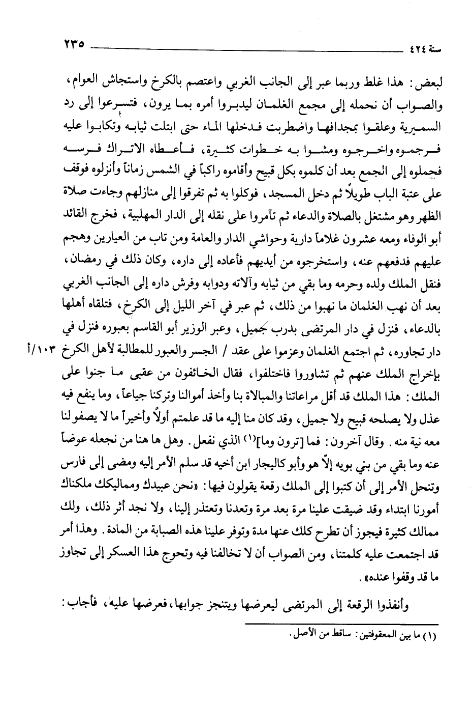 لبعض: هذا غلط وربما عبر إلى الجانب الغربي واعتصم بالكرخ واستجاش العوام، والصواب أن نحمله إلى مجمع الغلمان ليدبروا أمره بما يرون، فتسرعوا إلى رد السميرية وعلقوا بمجدافها واضطربت فدخلها الماء حتى ابتلت ثيابه وتكابوا عليه فرجموه وأخرجوه ومشوا به خطوات كثيرة، فأعطاه الأتراك فرسه فحملوه إلى الجمع بعد أن كلموه بكل قبيح وأقاموه راكبا في الشمس زمانا وأنزلوه فوقف علي عتبة الباب طويلا ثم دخل المسجد، فوكلوا به ثم تفرقوا إلى منازلهم وجاءت صلاة الظهر وهو مشتغل بالصلاة والدعاء ثم تآمروا على نقله إلى الدار المهلبية، فخرج القائد أبو الوفاء ومعه عشرون غلاما دارية وحواشي الدار والعامة ومن تاب من العيارين وهجم عليهم فدفعهم عنه، واستخرجوه من أيديهم فأعاده إلى داره، وكان ذلك في رمضان، فنقل الملك ولده وحرمه وما بقى من ثيابه وآلاته ودوابه وفرش داره إلى الجانب الغربي بعد أن نهب الغلمان ما نهبوا من ذلك، ثم عبر في آخر الليل إلى الكرخ، فتلقاه أهلها بالدعاء، فنزل في دار المرتضى بدرب جميل، وعبر الوزير أبو القاسم بعبوره فنزل في دار تجاوره، ثم اجتمع الغلمان وعزموا علي عقد/ الجسر والعبور للمطالبة لأهل الكرخ بإخراج الملك عنهم ثم تشاوروا فاختلفوا، فقال الخائفون من عقبي ما جنوا على الملك: هذا الملك قد أقل مراعاتنا والمبالاة بنا وأخذ أموالنا وتركنا جياعا، وما ينفع فيه عذل ولا يصلحه قبيح ولا جميل، وقد كان منا إليه ما قد علمتم أولا وأخيرا ما لا يصفو لنا معه نية منه. وقال آخرون: فما [ترون وما] [1] الّذي نفعل. وهل هاهنا من نجعله عوضا عنه وما بقى من بني بويه إلا هو وأبو كاليجار ابن أخيه قد سلم الأمر إليه ومضى إلى فارس وتنحل الأمر إلى أن كتبوا إلى الملك رقعة يقولون فيها: «نحن عبيدك ومماليكك ملكناك أمورنا ابتداء وقد ضيقت علينا مرة بعد مرة وتعدنا وتعتذر إلينا، ولا نجد أثر ذلك، ولك ممالك كثيرة فيجوز أن تطرح كلك عنها مدة وتوفر علينا هذه الصبابة من المادة. وهذا أمر قد اجتمعت عليه كلمتنا، ومن الصواب أن لا تخالفنا فيه وتحوج هذا العسكر إلى تجاوز ما قد وقفوا عنده» .