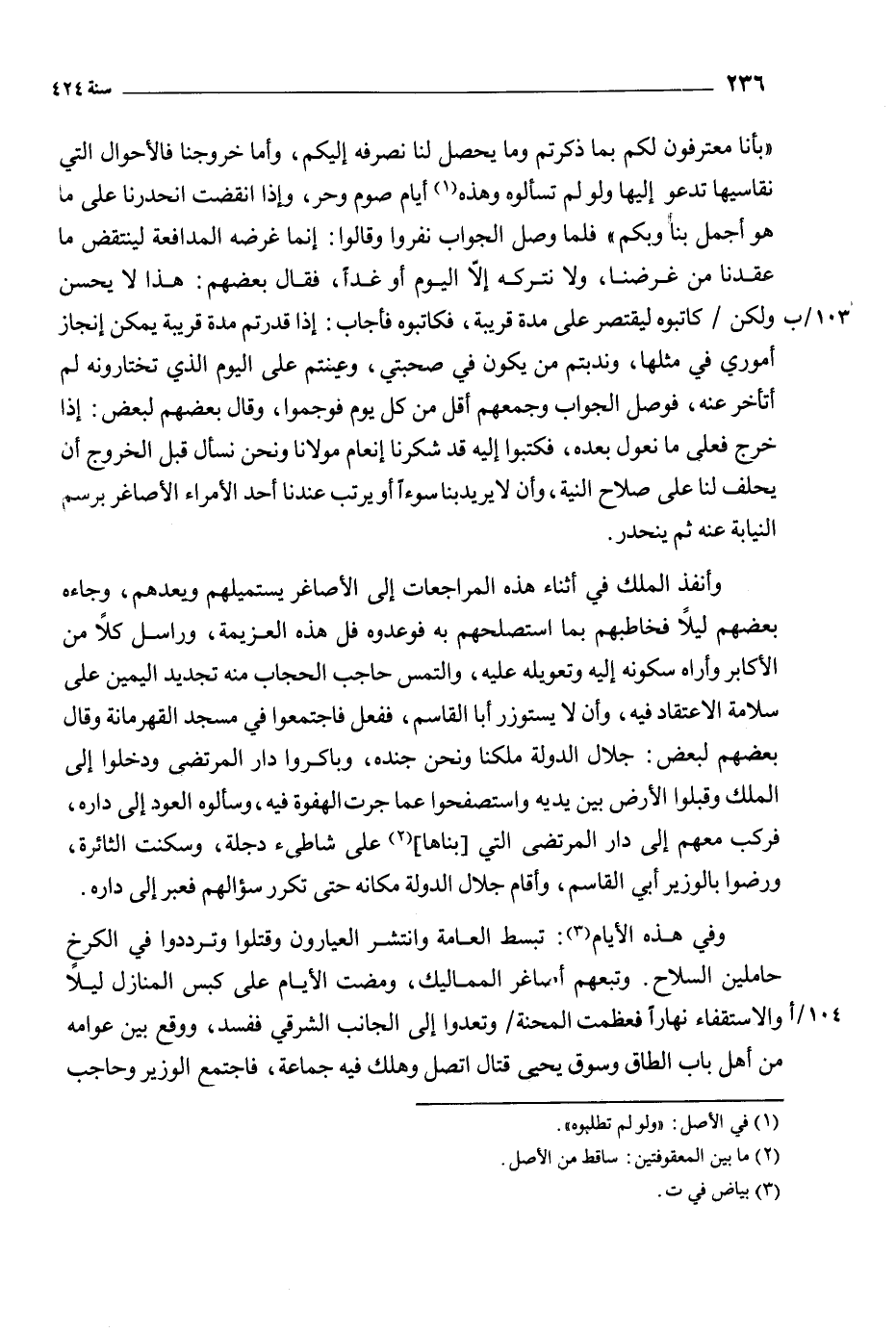 وفي هذه الأيام [3] : تبسط العامة وانتشر العيارون وقتلوا وترددوا في الكرخ حاملين السلاح. وتبعهم أصاغر المماليك، ومضت الأيام علي كبس المنازل ليلا والاستقفاء نهارا فعظمت المحنة/ وتعدوا إلى الجانب الشرقي ففسد، ووقع بين عوامه من أهل باب الطاق وسوق يحيى قتال اتصل وهلك فيه جماعة، فاجتمع الوزير وحاجب