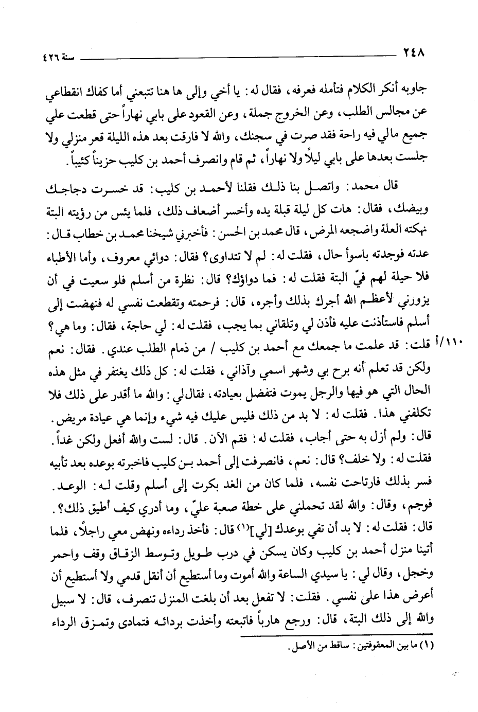 جاوبه أنكر الكلام فتأمله فعرفه، فقال له: يا أخي وإلى هاهنا تتبعني أما كفاك انقطاعي عن مجالس الطلب، وعن الخروج جملة، وعن القعود على بابي نهارا حتى قطعت علي جميع ما لي فيه راحة فقد صرت في سجنك، والله لا فارقت بعد هذه الليلة قعر منزلي ولا جلست بعدها على بابي ليلا ولا نهارا، ثم قام وانصرف أحمد بن كليب حزينا كئيبا.