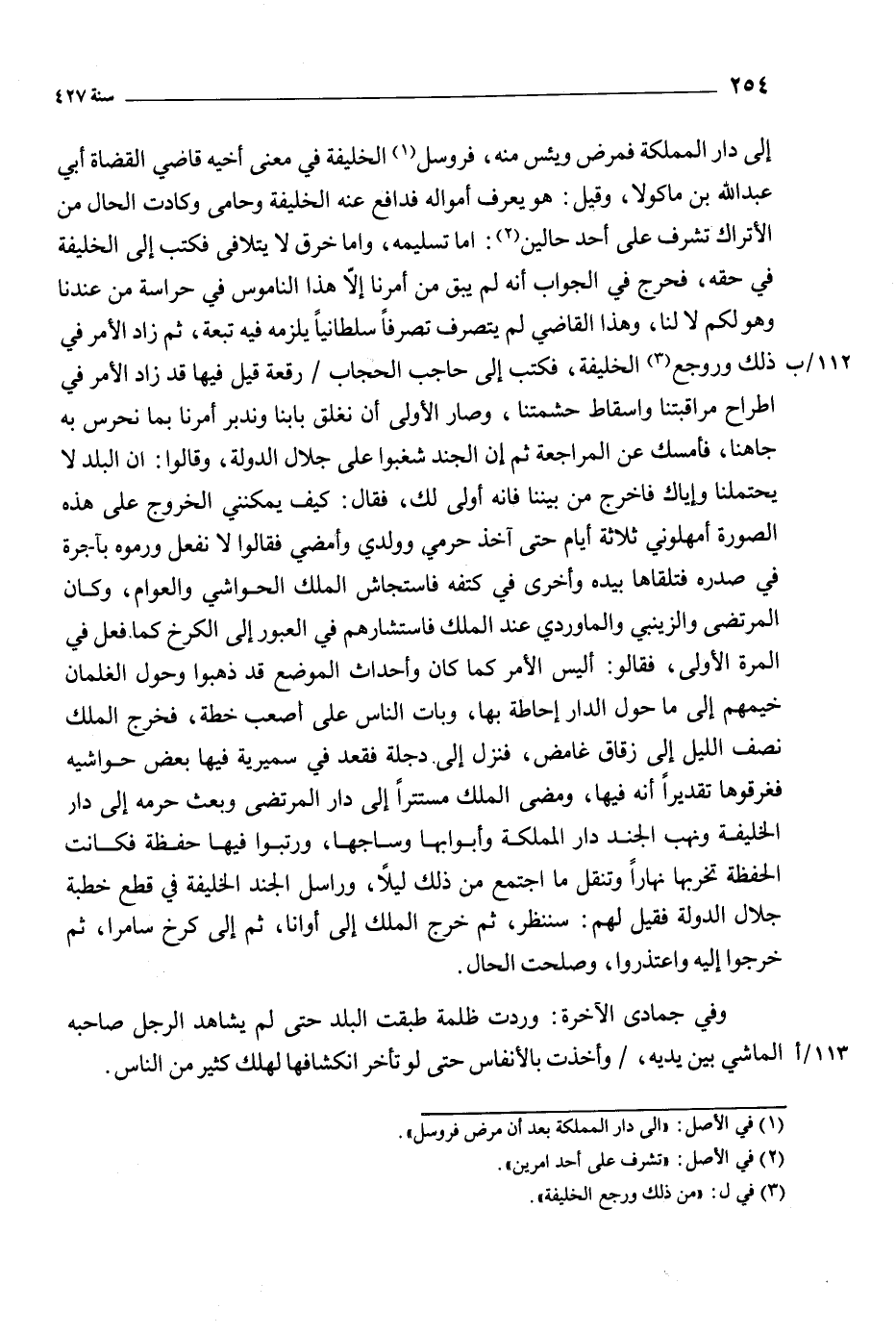 إلى دار المملكة فمرض ويئس منه، فروسل [1] الخليفة في معنى أخيه قاضي القضاة أبي عبد الله بن ماكولا، وقيل: هو يعرف أمواله فدافع عنه الخليفة وحامى وكادت الحال من الأتراك تشرف على أحد حالين [2] : إما تسليمه، وإما خرق لا يتلافى فكتب إلى الخليفة في حقه، فحرج في الجواب أنه لم يبق من أمرنا إلا هذا الناموس في حراسة من عندنا وهو لكم لا لنا، وهذا القاضي لم يتصرف تصرفا سلطانيا يلزمه فيه تبعة، ثم زاد الأمر في ذلك ورجع [3] الخليفة، فكتب إلى حاجب الحجاب/ رقعة قيل فيها قد زاد الأمر في إطراح مراقبتنا وإسقاط حشمتنا، وصار الأولى أن نغلق بابنا وندبر أمرنا بما نحرس به جاهنا، فأمسك عن المراجعة ثم إن الجند شغبوا على جلال الدولة، وقالوا: أن البلد لا يحتملنا وإياك فاخرج من بيننا فإنه أولى لك، فقال: كيف يمكنني الخروج على هذه الصورة أمهلوني ثلاثة أيام حتى آخذ حرمي وولدي وأمضي فقالوا لا نفعل ورموه بآجرة في صدره فتلقاها بيده وأخرى في كتفه فاستجاش الملك الحواشي والعوام، وكان المرتضى والزينبي والماوردي عند الملك فاستشارهم في العبور إلى الكرخ كما فعل في المرة الأولى، فقالوا: أليس الأمر كما كان وأحداث الموضع قد ذهبوا وحول الغلمان خيمهم إلى ما حول الدار إحاطة بها، وبات الناس على اصعب خطة، فخرج الملك نصف الليل إلى زقاق غامض، فنزل إلى دجلة فقعد في سميرية فيها بعض حواشيه فغرقوها تقديرا أنه فيها، ومضى الملك مستترا إلى دار المرتضى وبعث حرمه إلى دار الخليفة ونهب الجند دار المملكة وأبوابها وساجها، ورتبوا فيها حفظة فكانت الحفظة تخربها نهارا وتنقل ما اجتمع من ذلك ليلا، وراسل الجند الخليفة في قطع خطبة جلال الدولة فقيل لهم: سننظر، ثم خرج الملك إلى أوانا، ثم إلى كرخ سامرا، ثم خرجوا إليه واعتذروا، وصلحت الحال.