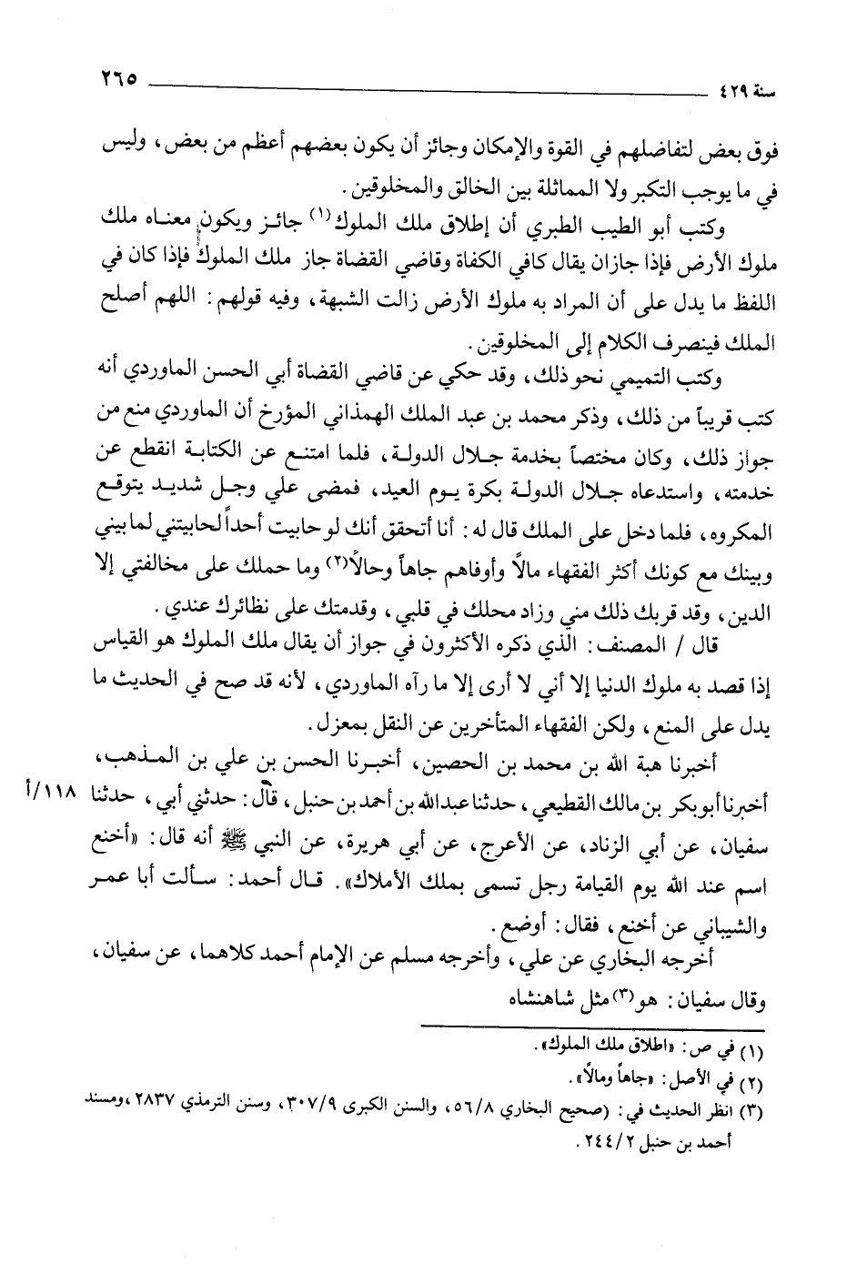 وكتب أبو الطيب الطبري أن إطلاق ملك الملوك [1] جائز ويكون معناه ملك ملوك الأرض فإذا جاز أن يقال كافي الكفاة وقاضي القضاة جاز ملك الملوك فإذا كان في اللفظ ما يدل على أن المراد به ملوك الأرض زالت الشبهة، وفيه قولهم: اللَّهمّ أصلح الملك فينصرف الكلام إلى المخلوقين.