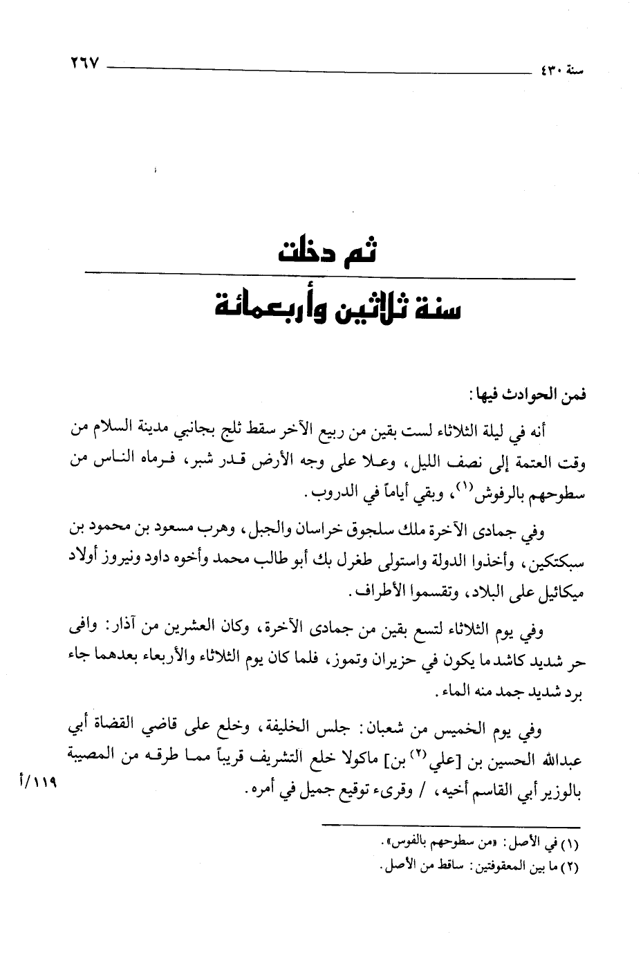 أنه في ليلة الثلاثاء لست بقين من ربيع الآخر سقط ثلج بجانبي مدينة السلام من وقت العتمة إلى نصف الليل، وعلا على وجه الأرض قدر شبر، فرماه الناس من سطوحهم بالرفوش [1] ، وبقي أياما في الدروب.