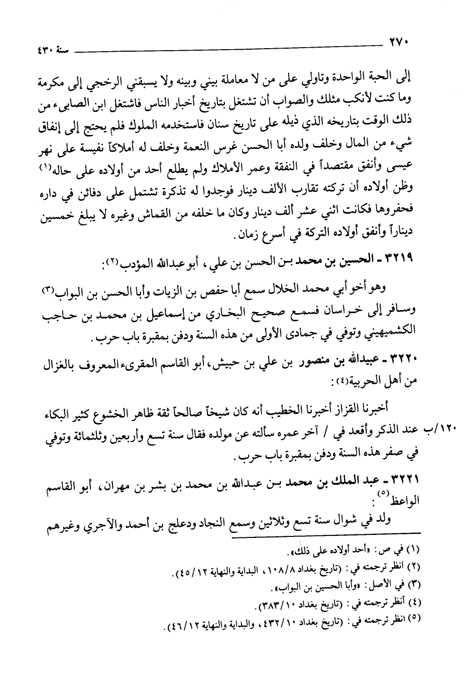 [5] انظر ترجمته في: (تاريخ بغداد 10/ 432، والبداية والنهاية 12/ 46) .