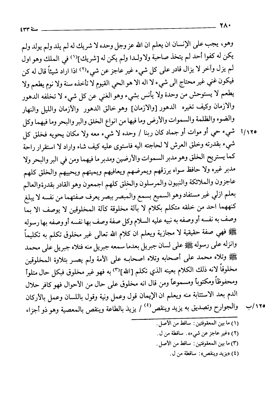 وهو، يجب على الإنسان أن يعلم أن الله عز وجل وحده لا شريك له لم يلد ولم يولد ولم يكن له كفوا أحد لم يتخذ صاحبه ولا ولدا ولم يكن له [شريك] [1] في الملك وهو أول لم يزل وآخر لا يزال قادر على كل شيء غير عاجز عن شيء [2] إذا أراد شيئا قال له كن فيكون غنى غير محتاج إلى شيء لا اله إلا هو الحي القيوم لا تأخذه سنة ولا نوم يطعم ولا يطعم لا يستوحش من وحده ولا يأنس بشيء وهو الغنى عن كل شيء لا تخلفه الدهور والأزمان وكيف تغيره الدهور [والأزمان] وهو خالق الدهور والأزمان والليل والنهار والضوء والظلمة والسموات والأرض وما فيها من أنواع الخلق والبر والبحر وما فيهما وكل شيء حي أو موات أو جماد كان ربنا/ وحده لا شيء معه ولا مكان يحويه فخلق كل شيء بقدرته وخلق العرش لا لحاجته إليه فاستوى عليه كيف شاء وأراد لا استقرار راحة كما يستريح الخلق وهو مدبر السموات والارضين ومدبر ما فيهما ومن في البر والبحر ولا مدبر غيره ولا حافظ سواه يرزقهم ويمرضهم ويعافيهم ويميتهم ويحييهم والخلق كلهم عاجزون والملائكة والنبيون والمرسلون والخلق كلهم أجمعون وهو القادر بقدرة والعالم بعلم أزلي غير مستفاد وهو السميع بسمع والمبصر ببصر يعرف صفتهما من نفسه لا يبلغ كنههما أحد من خلقه متكلم بكلام لا بآلة مخلوقة كآلة المخلوقين لا يوصف إلا بما وصف به نفسه أو وصفه به نبيه عليه السلام وكل صفة وصف بها نفسه أو وصفه بها رسوله صلى الله عليه وسلّم فهي صفة حقيقية لا مجازية ويعلم أن كلام الله تعالى غير مخلوق تكلم به تكليما وأنزله على رسوله صلى الله عليه وسلم على لسان جبريل بعد ما سمعه جبريل منه فتلاه جبريل على محمد صلى الله عليه وسلم وتلاه محمد على أصحابه وتلاه أصحابه على الأمة ولم يصر بتلاوة المخلوقين مخلوقا لأنه ذلك الكلام بعينه الذي تكلم [الله] [3] به فهو غير مخلوق فبكل حال متلوا ومحفوظا ومكتوبا ومسموعا ومن قال إنه مخلوق على حال من الأحوال فهو كافر حلال الدم بعد الاستتابة منه ويعلم أن الإيمان قول وعمل ونية وقول باللسان وعمل بالأركان والجوارح وتصديق به يزيد وينقص [4] / يزيد بالطاعة وينقص بالمعصية وهو ذو أجزاء