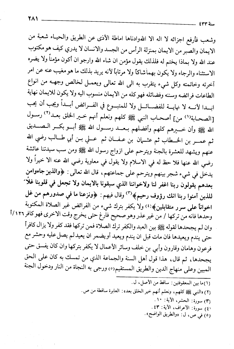 وشعب فأرفع اجزائه لا إله الا الله وأدناها إماطة الأذى عن الطريق والحياء شعبة من الإيمان والصبر من الإيمان بمنزلة الرأس من الجسد والإنسان لا يدري كيف هو مكتوب عند الله ولا بماذا يختم له فلذلك يقول مؤمن أن شاء الله وأرجو أن أكون مؤمنا ولا يضره الاستثناء والرجاء ولا يكون بهما شاكا ولا مرتابا لأنه يريد بذلك ما هو مغيب عنه عن أمر آخرته وخاتمته وكل شيء يتقرب به إلى الله تعالى ويعمل لخالص وجهه من أنواع الطاعات فرائضه وسننه وفضائله فهو كله من الإيمان منسوب إليه ولا يكون للإيمان نهاية أبدا لأنه لا نهاية للفضائل ولا للمتبوع في الفرائض أبدا ويجب أن يحب [الصحابة [1] من] أصحاب النبي صلى الله عليه وسلم كلهم ونعلم أنهم خير الخلق بعد [2] رسول الله صَلَّى اللَّهُ عَلَيْهِ وَسَلَّمَ وأن خيرهم كلهم وأفضلهم بعد رسول الله صَلَّى اللَّهُ عَلَيْهِ وَسَلَّمَ أبو بكر الصديق ثم عمر بن الخطاب ثم عثمان بن عفان ثم عَلِيِّ بْنِ أَبِي طَالِبٍ رَضِيَ اللَّهُ عَنْهُمْ ويشهد للعشرة بالجنة ويترحم على أزواج رسول الله صَلى اللهُ عَلَيه وسلم ومن سب سيدتنا عائشة رضي الله عنها فلا حظ له في الإسلام ولا يقول في معاوية رضي الله عنه إلا خيرا ولا يدخل في شيء شجر بينهم ويترحم على جماعتهم، قال الله تعالى: وَالَّذِينَ جاؤُ مِنْ بَعْدِهِمْ يَقُولُونَ رَبَّنَا اغْفِرْ لَنا وَلِإِخْوانِنَا الَّذِينَ سَبَقُونا بِالْإِيمانِ وَلا تَجْعَلْ فِي قُلُوبِنا غِلًّا لِلَّذِينَ آمَنُوا رَبَّنا إِنَّكَ رَؤُفٌ رَحِيمٌ 59: 10 [3] وقال فيهم: وَنَزَعْنا مَا فِي صُدُورِهِمْ مِنْ غِلٍّ إِخْواناً عَلى سُرُرٍ مُتَقابِلِينَ 15: 47 [4] وَلا يُكَفَّرُ بِتَرْكِ شَيْءٍ مِنَ الْفَرَائِضِ غَيْرَ الصَّلاةِ الْمَكْتُوبَةِ وَحْدَهَا فَإِنَّهُ مَنْ تَرَكَهَا/ مِنْ غَيْرِ عُذْرٍ وَهُوَ صَحِيحٌ فَارِغٌ حَتَّى يَخْرُجَ وَقْتُ الأُخْرَى فَهُوَ كَافِرٌ وَإِنْ لَمْ يَجْحَدْهَا لقوله صَلَّى اللَّهُ عَلَيْهِ وَسَلَّمَ بَيْنَ الْعَبْدِ وَالْكُفْرِ تَرْكُ الصَّلاةِ فَمَنْ تَرَكَهَا فَقَدْ كَفَرَ وَلا يَزَالُ كَافِرًا حَتَّى يَنْدَمَ وَيُعِيدَهَا فَإِنْ مَاتَ قَبْلَ أَنْ يَنْدَمَ وَيُعِيدَ أَوْ يُضْمِرَ أَنْ يُعِيدَ لَمْ يُصَلَّ عَلَيْهِ وَحُشِرَ مَعَ فِرْعَوْنَ وَهَامَانَ وَقَارُونَ وَأُبَيِّ بْنِ خَلَفٍ وَسَائِرُ الأَعْمَالِ لا يُكَفَّرُ بِتَرْكِهَا وَإِنْ كَانَ يُفَسَّقُ حَتَّى يَجْحَدَهَا، ثُمَّ قَالَ: هَذَا قَوْلُ أَهْلِ السُّنَّةِ وَالْجَمَاعَةِ الَّذِي مَنْ تَمَسَّكَ بِهِ كَانَ عَلَى الحق المبين وعلى منهاج الدين والطريق المستقيم [5] ورجا به النجاة من النار ودخول الجنة