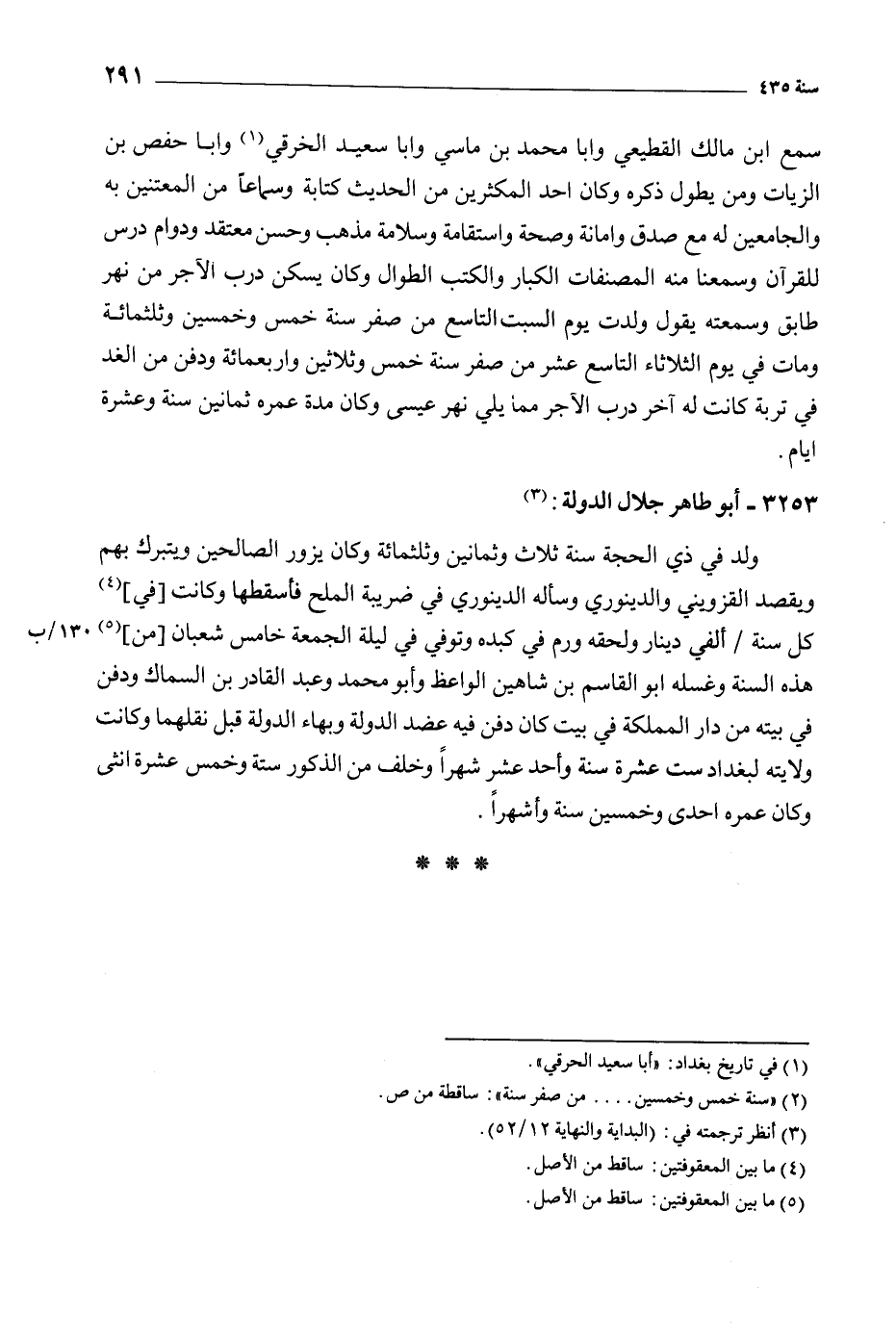 [3] ولد في ذي الحجة سنة ثلاث وثمانين وثلاثمائة وكان يزور الصالحين ويتبرك بهم ويقصد القزويني والدينَوَريّ وسأله الدينَوَريّ في ضريبة الملح فأسقطها وكانت [في] [4] كل سنة/ ألفي دينار ولحقه ورم في كبده وتوفي في ليلة الجمعة خامس شعبان [من] [5] هذه السنة وغسله أبو القاسم بن شاهين الواعظ وأبو محمد وعبد القادر بن السماك ودفن في بيته من دار المملكة في بيت كان دفن فيه عضد الدولة وبهاء الدولة قبل نقلهما وكانت ولايته لبغداد ست عشرة سنة وأحد عشر شهرا وخلف من الذكور ستة وخمس عشرة أنثى وكان عمره احدى وخمسين سنة وأشهرا.
