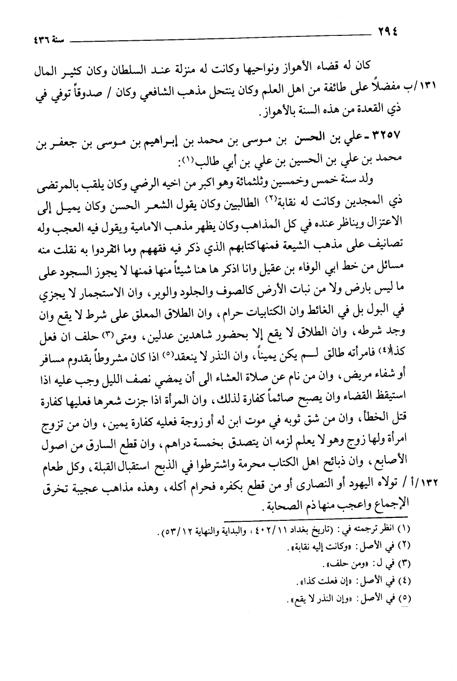 ولد سنة خمس وخمسين وثلاثمائة وهو أكبر من أخيه الرضى وكان يلقب بالمرتضى ذي المجدين وكانت له نقابة [2] الطالبيين وكان يقول الشعر الحسن وكان يميل إلى الاعتزال ويناظر عنده في كل المذاهب وكان يظهر مذهب الإمامية ويقول فيه العجب وله تصانيف على مذهب الشيعة فمنها كتابهم الذي ذكر فيه فقههم وما انفردوا به نقلت منه مسائل من خط أبي الوفاء بن عقيل وانا اذكرها هنا شيئا منها فمنها لا يجوز السجود على ما ليس بأرض ولا من نبات الأرض كالصوف والجلود والوبر، وأن الاستجمار لا يجزى في البول بل في الغائط وأن الكتابيات حرام، وأن الطلاق المعلق على شرط لا يقع وإن وجد شرطه، وأن الطلاق لا يقع إلا بحضور شاهدين عدلين، ومتى [3] حلف إن فعل كذا [4] فامرأته طالق لم يكن يمينا، وأن النذر لا ينعقد [5] إذا كان مشروطا بقدوم مسافر أو شفاء مريض، وأن من نام عن صلاة العشاء إلى أن يمضي نصف الليل وجب عليه إذا استيقظ القضاء وأن يصبح صائما كفارة لذلك، وأن المرأة إذا جزت شعرها فعليها كفارة قتل الخطأ، وأن من شق ثوبه في موت ابن له أو زوجة فعليه كفارة يمين، وأن من تزوج امرأة ولها زوج وهو لا يعلم لزمه أن يتصدق بخمسة دراهم، وأن قطع السارق من أصول الأصابع، وأن ذبائح أهل الكتاب محرمة واشترطوا في الذبح استقبال القبلة، وكل طعام تولاه اليهود أو النصارى أو من قطع بكفره فحرام أكله، وهذه مذاهب عجيبة تخرق الإجماع وأعجب منها ذم الصحابة.
