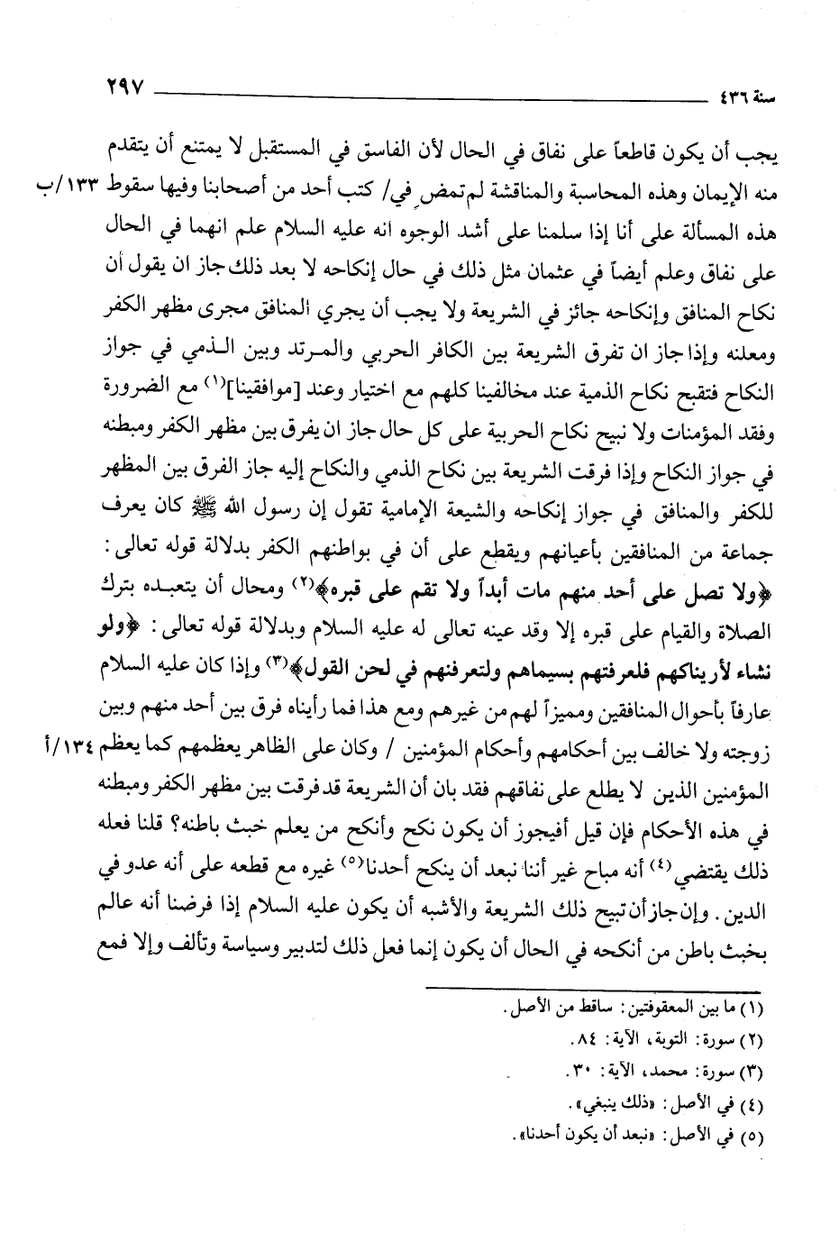 وَلا تُصَلِّ عَلى أَحَدٍ مِنْهُمْ ماتَ أَبَداً وَلا تَقُمْ عَلى قَبْرِهِ 9: 84 [2] ومحال أن يتعبده بترك الصلاة والقيام على قبره إلا وقد عينه تعالى له عليه السلام وبدلالة قوله تعالى: وَلَوْ نَشاءُ لَأَرَيْناكَهُمْ فَلَعَرَفْتَهُمْ بِسِيماهُمْ وَلَتَعْرِفَنَّهُمْ في لَحْنِ الْقَوْلِ 47: 30 [3] وإذا كان عليه السلام عارفا بأحوال المنافقين ومميزا لهم من غيرهم ومع هذا فما رأيناه فرق بين أحد منهم وبين زوجته ولا خالف بين أحكامهم وأحكام المؤمنين/ وكان على الظاهر يعظمهم كما يعظم المؤمنين الذين لا يطلع على نفاقهم فقد بان أن الشريعة قد فرقت بين مظهر الكفر ومبطنه في هذه الأحكام فإن قيل أفيجوز أن يكون نكح وأنكح من يعلم خبث باطنه؟ قلنا فعله ذلك يقتضي [4] أنه مباح غير أننا نبعد أن ينكح أحدنا [5] غيره مع قطعه على أنه عدو في الدين. وإن جاز أن تبيح ذلك الشريعة والأشبه أن يكون عليه السلام إذا فرضنا أنه عالم بخبث باطن من أنكحه في الحال أن يكون إنما فعل ذلك لتدبير وسياسة وتألف وإلا فمع