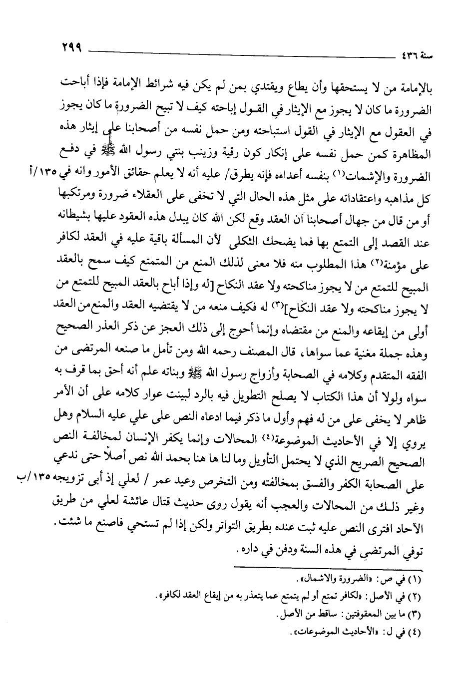 بالإمامة من لا يستحقها وأن يطاع ويقتدي بمن لم يكن فيه شرائط الإمامة فإذا أباحت الضرورة ما كان لا يجوز مع الإيثار في القول إباحته كيف لا تبيح الضرورة ما كان يجوز في العقول مع الإيثار في القول استباحته ومن حمل نفسه من أصحابنا على إيثار هذه المظاهرة كمن حمل نفسه على إنكار كون رقية وزينب بنتي رسول الله صلى الله عليه وسلم في دفع الضرورة والإشمات [1] بنفسه أعداءه فانه يطرق/ عليه أنه لا يعلم حقائق الأمور وأنه في كل مذاهبه واعتقاداته على مثل هذه الحال التي لا تخفى على العقلاء ضرورة ومرتكبها أو من قال من جهال أصحابنا أن العقد وقع لكن الله كان يبدل هذه العقود عليها بشيطانه عند القصد إلى التمتع بها فما يضحك الثكلى لأن المسألة باقية عليه في العقد لكافر على مؤمنة [2] هذا المطلوب منه فلا معنى لذلك المنع من المتمتع كيف سمح بالعقد المبيح للتمتع من لا يجوز مناكحته ولا عقد النكاح [له وإذا أباح بالعقد المبيح للتمتع من لا يجوز مناكحته ولا عقد النكاح] [3] له فكيف منعه من لا يقتضيه العقد والمنع من العقد أولى من إيقاعه والمنع من مقتضاه وإنما أحوج إلى ذلك العجز عن ذكر العذر الصحيح وهذه جملة مغنية عما سواها، قال المصنف رحمه الله ومن تأمل ما صنعه المرتضى من الفقه المتقدم وكلامه في الصحابة وأزواج رسول الله صلى الله عليه وسلم وبناته علم أنه أحق بما قرف به سواه ولولا أن هذا الكتاب لا يصلح التطويل فيه بالرد لبينت عوار كلامه على أن الأمر ظاهر لا يخفى على من له فهم وأول ما ذكر فيما ادعاه النص على علي عليه السلام وهل يروى إلا في الأحاديث الموضوعة [4] المحالات وإنما يكفر الإنسان لمخالفة النص الصحيح الصريح الّذي لا يحتمل التأويل وما لنا ها هنا بحمد الله نص أصلا حتى ندعى على الصحابة الكفر والفسق بمخالفته ومن التخرص وعيد عمر/ لعلي إذ أبي تزويجه وغير ذلك من المحالات والعجب أنه يقول روى حديث قتال عائشة لعلي من طريق الآحاد أفترى النص عليه ثبت عنده بطريق التواتر ولكن إِذَا لَمْ تَسْتَحْيِ فاصنع ما شئت.