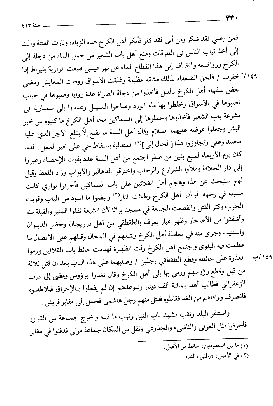 فمن رضي فقد شكر ومن أبي فقد كفر فأنكر أهل الكرخ هذه الزيادة وثارت الفتنة وآلت إلى أخذ ثياب الناس في الطرقات ومنع أهل باب الشعير من حمل الماء من دجلة إلى الكرخ ورواضعه وأنضاف إلى هذا انقطاع الماء عن نهر عيسى فبيعت الراوية بقيراط إذا خفرت/ فلحق الضعفاء بذلك مشقة عظيمة وغلقت الأسواق ووقفت المعايش ومضى بعض سفهاء أهل الكرخ بالليل فأخذوا من دجلة الصراة عدة روايا وصبوها في حباب نصبوها في الأسواق وخلطوا بها ماء الورد وصاحوا السبيل وعمدوا إلى سمارية في مشرعة باب الشعير فأخذوها وحملوها إلى السماكين محا أهل الكرخ ما كتبوه من خير البشر وجعلوا عوضه عليهما السلام وقال أهل السنة ما نقنع إلا بقلع الآجر الذي عليه محمد وعلي وتجاوزوا هذا [الحال إلى] [1] المطالبة بإسقاط حي على خير العمل. فلما كان يوم الأربعاء لسبع بقين من صفر اجتمع من أهل السنة عدد يفوت الاحصاء وعبروا إلى دار الخلافة وملئوا الشوارع والرحاب واخترقوا الدهاليز والأبواب وزاد اللغط وقيل لهم سنبحث عن هذا وهجم أهل القلائين على باب السماكين فأحرقوا بواري كانت مسبلة في وجهه فبادر أهل الكرخ وطفئت النار [2] وبيضوا ما أسود من الباب وقويت الحرب وكثر القتل وانقطعت الجمعة في مسجد براثا لأن الشيعة نقلوا المنبر والقبلة منه وأشفقوا من الأصحار وظهر عيار يعرف بالطقطقي من أهل درزيجان وحضر الديوان واستتيب وجرى منه في معاملة أهل الكرخ وتتبعهم في المحال وقتلهم على الاتصال ما عظمت فيه البلوي واجتمع أهل الكرخ وقت الظهيرة فهدمت حائط باب القلائين ورموا العذرة على حائطه وقطع الطقطقي رجلين/ وصلبهما على هذا الباب بعد أن قتل ثلاثة من قبل وقطع رءوسهم ورمى بها إلى أهل الكرخ وقال تغدوا برءوس ومضى إلى درب الزعفرانيّ فطالب أهله بمائة ألف دينار وتوعدهم إن لم يفعلوا بالإحراق فلاطفوه فانصرف ووافاهم من الغد فقاتلوه فقتل منهم رجل هاشمي فحمل إلى مقابر قريش.
