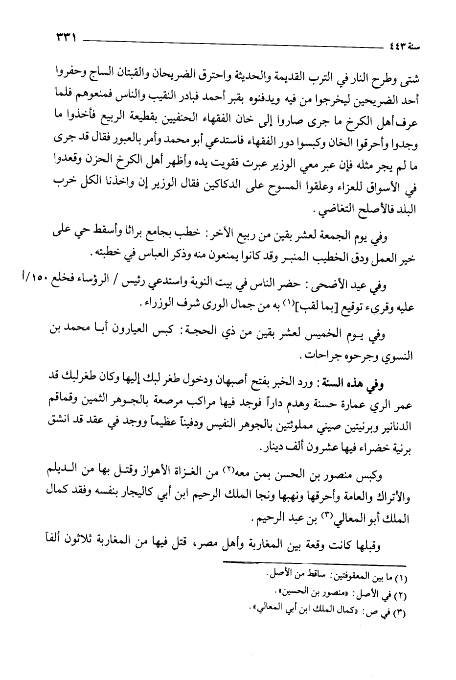 وكبس منصور بن الحسن بمن معه [2] من الغزاة الأهواز وقتل بها من الديلم والأتراك والعامة وأحرفها ونهبها ونجا الملك الرحيم ابن أبي كاليجار بنفسه وفقد كمال الملك أبو المعالي [3] بن عبد الرحيم.