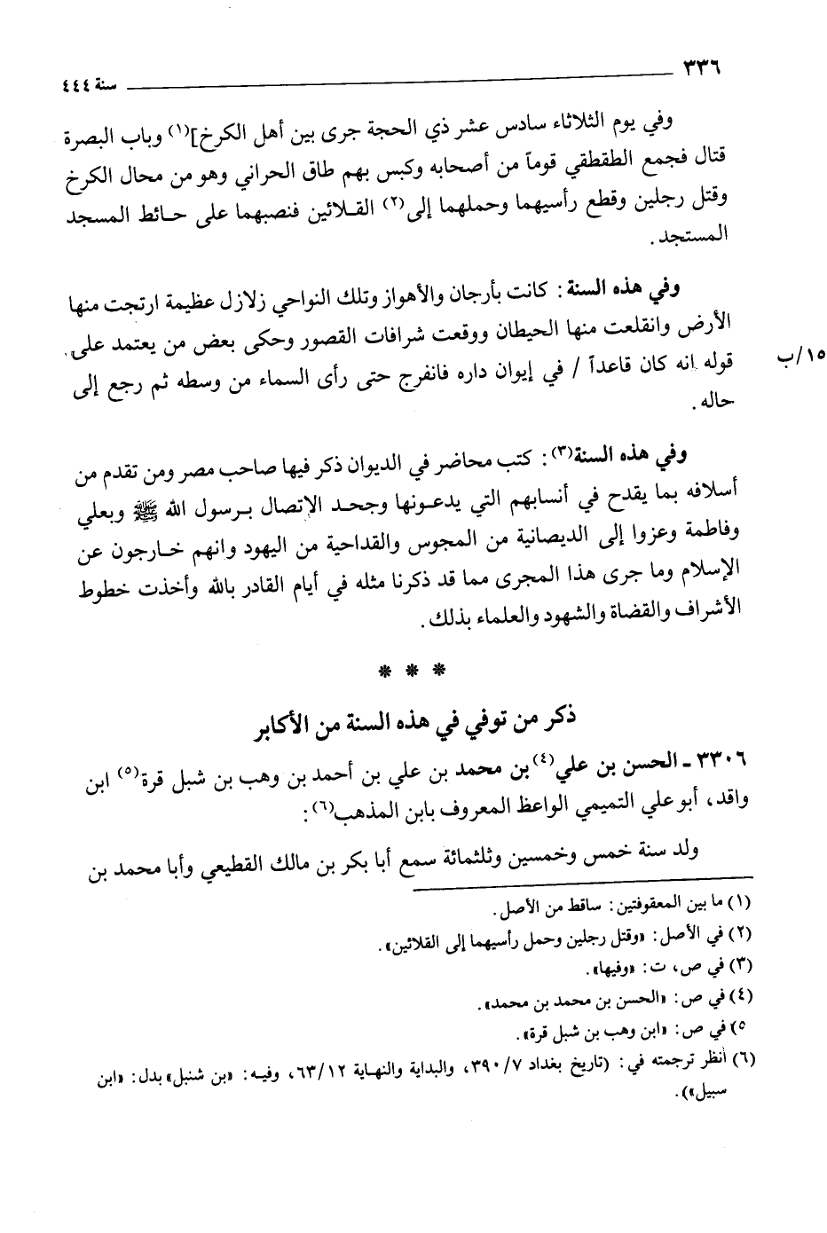 [6] انظر ترجمته في: (تاريخ بغداد 7/ 390، والبداية والنهاية 12/ 63، وفيه: «بن شنبل» بدل: «ابن سبيل» ) .
