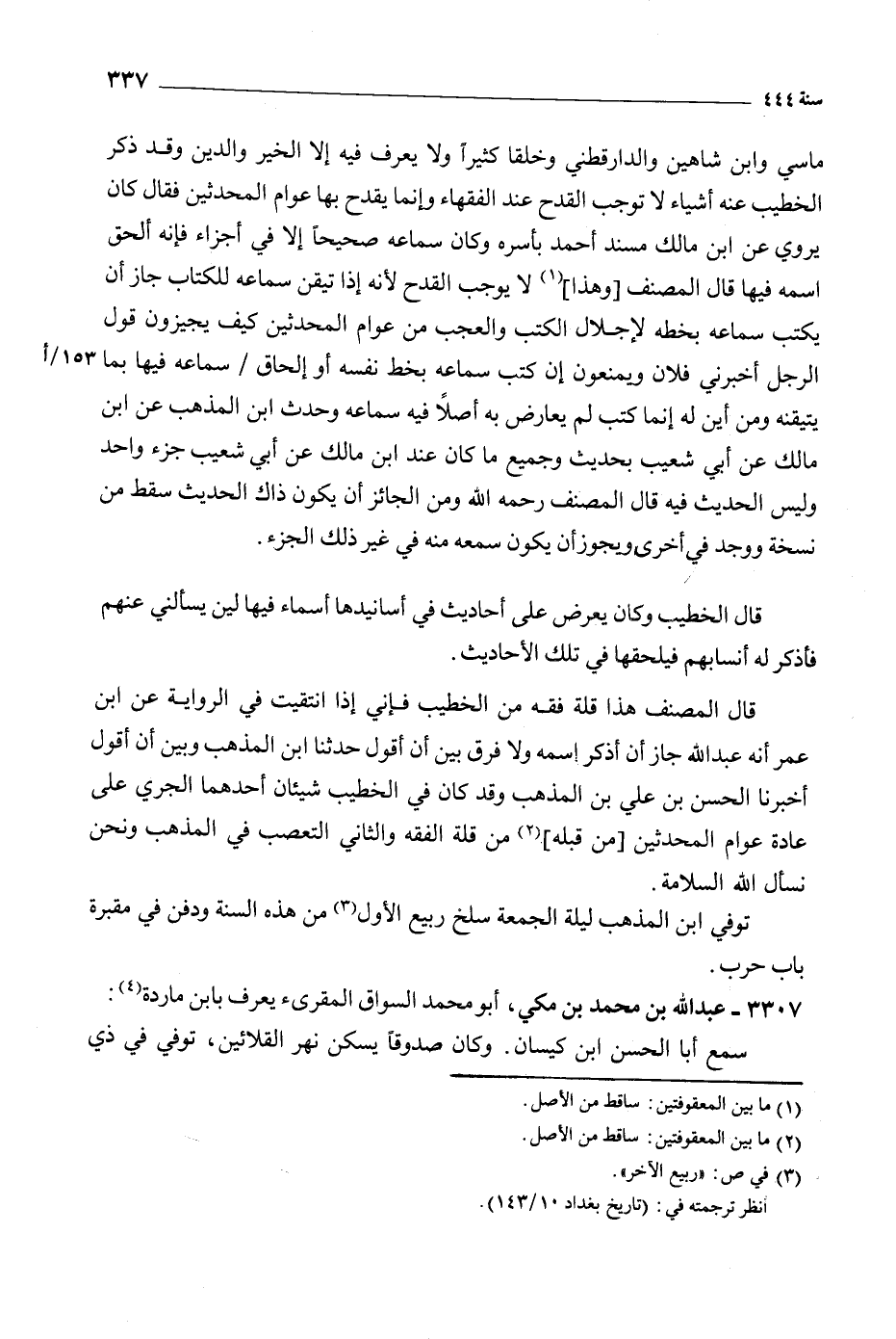 ماسي وابن شاهين والدار الدّارقطنيّ وخلقا كثيرا ولا يعرف فيه إلا الخير والدين وقد ذكر الخطيب عنه أشياء لا توجب القدح عند الفقهاء وإنما يقدح بها عوام المحدثين فقال كان يروى عن ابن مالك مسند أحمد بأسره وكان سماعه صحيحا إلا في أجزاء فإنه ألحق اسمه فيها قال المصنف [وهذا] [1] لا يوجب القدح لأنه إذا تيقن سماعه للكتاب جاز أن يكتب سماعه بخطه لإجلال الكتب والعجب من عوام المحدثين كيف يجيزون قول الرجل أخبرني فلان ويمنعون إن كتب سماعه بخط نفسه أو إلحاق/ سماعه فيها بما يتيقنه ومن أين له إنما كتب لم يعارض به أصلا فيه سماعه وحدث ابن المذهب عن ابن مالك عن أبي شعيب بحديث وجميع ما كان عند ابن مالك عن أبي شعيب جزء واحد وليس الحديث فيه قال المصنف رحمه الله ومن الجائز أن يكون ذاك الحديث سقط من نسخة ووجد في أخرى ويجوز أن يكون سمعه منه في غير ذلك الجزء.