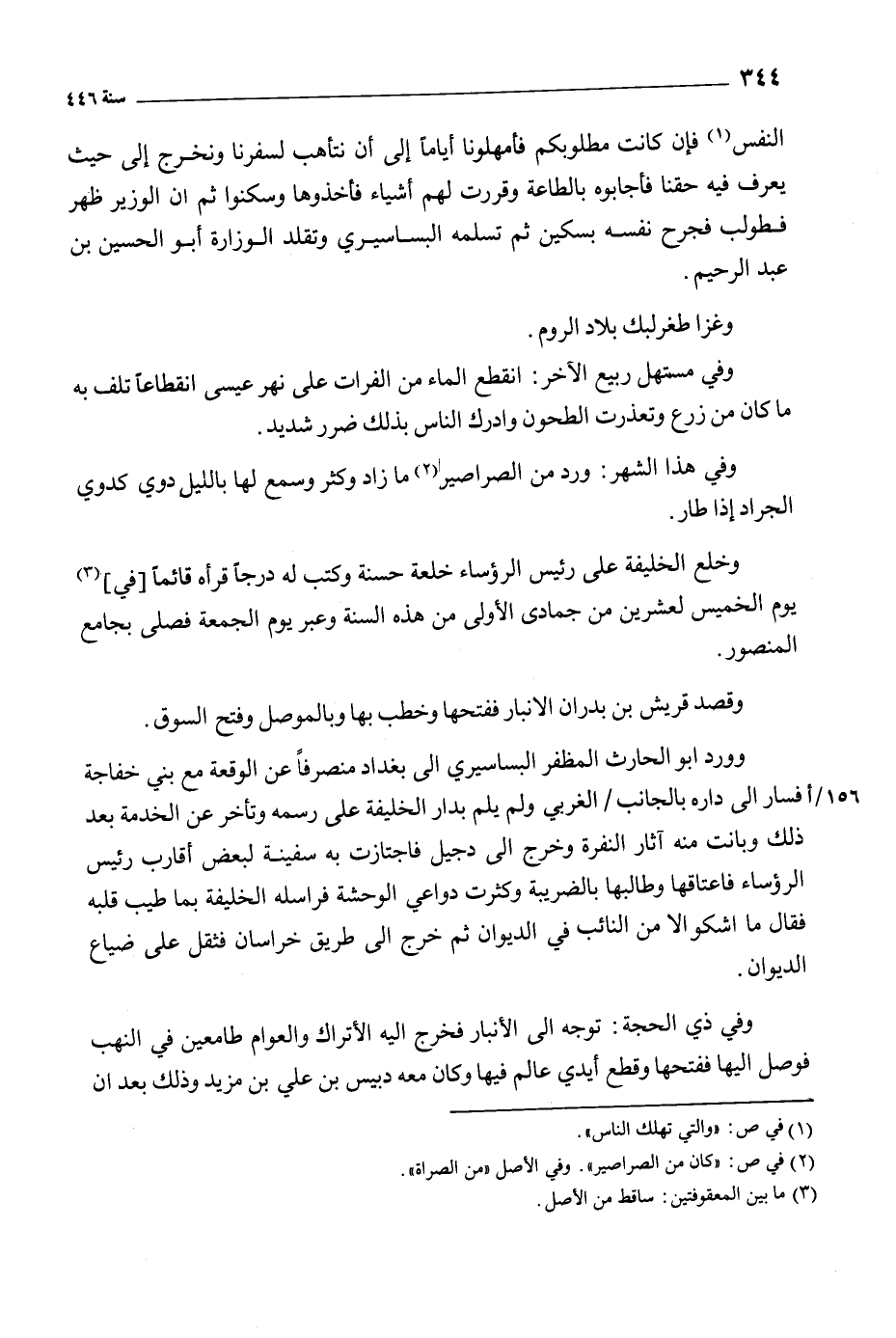 النفس [1] فان كانت مطلوبكم فأمهلونا أياما إلى أن نتأهب لسفرنا ونخرج إلى حيث يعرف فيه حقنا فأجابوه بالطاعة وقررت لهم أشياء فأخذوها وسكنوا ثم إن الوزير ظهر فطولب فجرح نفسه بسكين ثم تسلمه البساسيري وتقلد الوزارة أبو الحسين بن عبد الرحيم.
