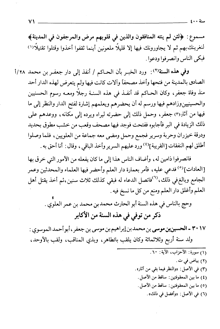 وفى هذه السنة [2] : ورد الخبر بأن الحاكم/ أنفذ إلى دار جعفر بن محمد الصادق بالمدينة من فتحها وأخذ مصحفا وآلات كانت فيها ولم يتعرض لهذه الدار أحد منذ وفاة جعفر، وكان الحاكم قد أنفذ في هذه السنة رجلا ومعه رسوم الحسنيين والحسينيين وزادهم فيها ورسم له أن يحضرهم ويعلمهم إشارة لفتح الدار والنظر إلى ما فيها من آثار [3] جعفر، وحمل ذلك إلى حضرته ليراه ويرده إلى مكانه، ووعدهم على ذلك الزيادة في البر فأجابوه ففتحت فوجد فيها مصحف وقعب من خشب مطوق بحديد ودرقة خيزران وحربة وسرير فجمع وحمل ومضى معه جماعة من العلويين، فلما وصلوا أطلق لهم النفقات [القريبة] [4] ورد عليهم السرير وأخذ الباقي، وقال: أنا أحق به.