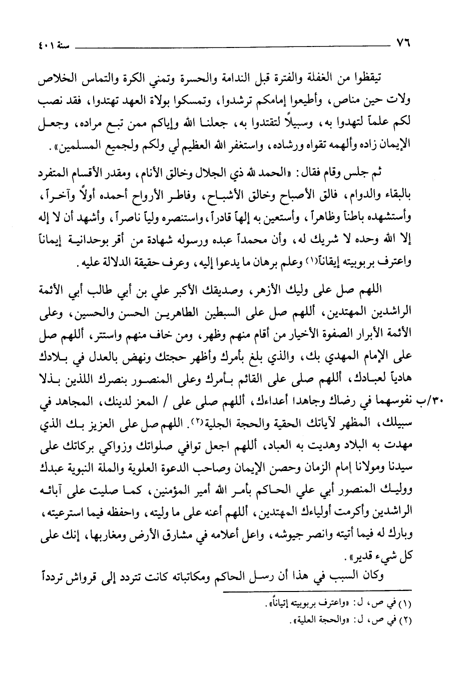 تيقظوا من الغفلة والفترة قبل الندامة والحسرة وتمنى الكرة والتماس الخلاص ولات حين مناص، وأطيعوا إمامكم ترشدوا، وتمسكوا بولاة العهد تهتدوا، فقد نصب لكم علما لتهدوا به، وسبيلا لتقتدوا به، جعلنا الله وإياكم ممن تبع مراده، وجعل الإيمان زاده والهمة تقواه ورشاده، واستغفر الله العظيم لي ولكم ولجميع المسلمين» .
