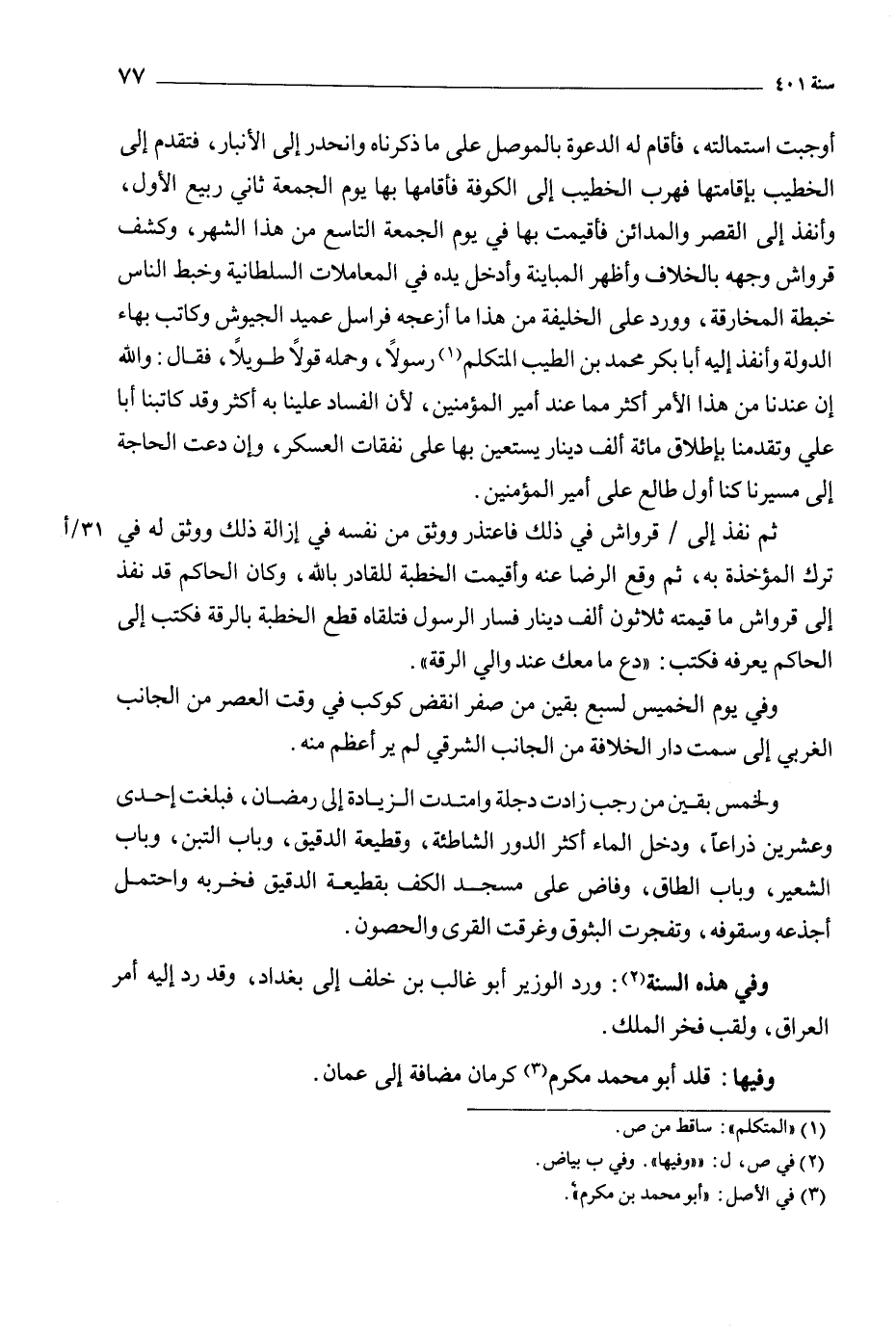 أوجبت استمالته، فأقام له الدعوة بالموصل على ما ذكرناه وانحدر إلى الأنبار، فتقدم إلى الخطيب بإقامتها فهرب الخطيب إلى الكوفة فأقامها بها يوم الجمعة ثاني ربيع الأول، وأنفذ إلى القصر والمدائن فأقيمت بها في يوم الجمعة التاسع من هذا الشهر، وكشف قرواش وجهه بالخلاف وأظهر المباينة وأدخل يده في المعاملات السلطانية وخبط الناس خبطة المخارقة، وورد على الخليفة من هذا ما أزعجه فراسل عميد الجيوش وكاتب بهاء الدولة وأنفذ إليه أبا بكر محمد بن الطيب المتكلم [1] رسولا، وحمله قولا طويلا، فقال: والله إن عندنا من هذا الأمر أكثر مما عند أمير المؤمنين، لأن الفساد علينا به أكثر وقد كاتبنا أبا على وتقدمنا بإطلاق مائة ألف دينار يستعين بها على نفقات العسكر، وإن دعت الحاجة إلى مسيرنا كنا أول طالع على أمير المؤمنين.