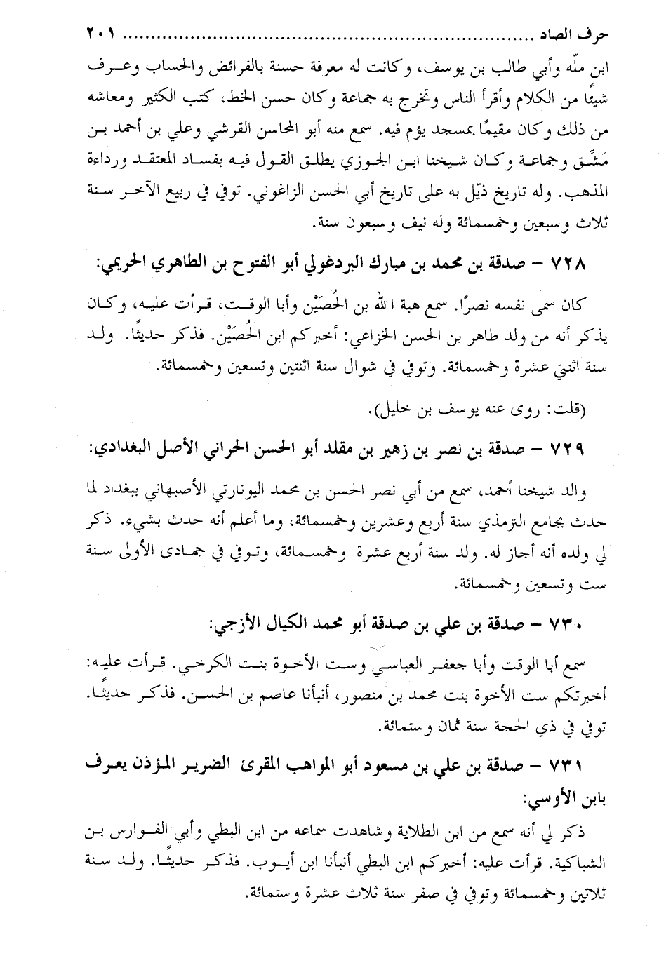 وجده وغيرهم وقدم بغداد حاجًا فتوفي بها بعد وصوله من مكَّة فِي صفر سنة أربع عشرة وستمائة. حَدَّثنا قَالَ: أنبأنا هبة الرَّحْمَن القشيري سنة خمس وأربعين وخمسمائة.
