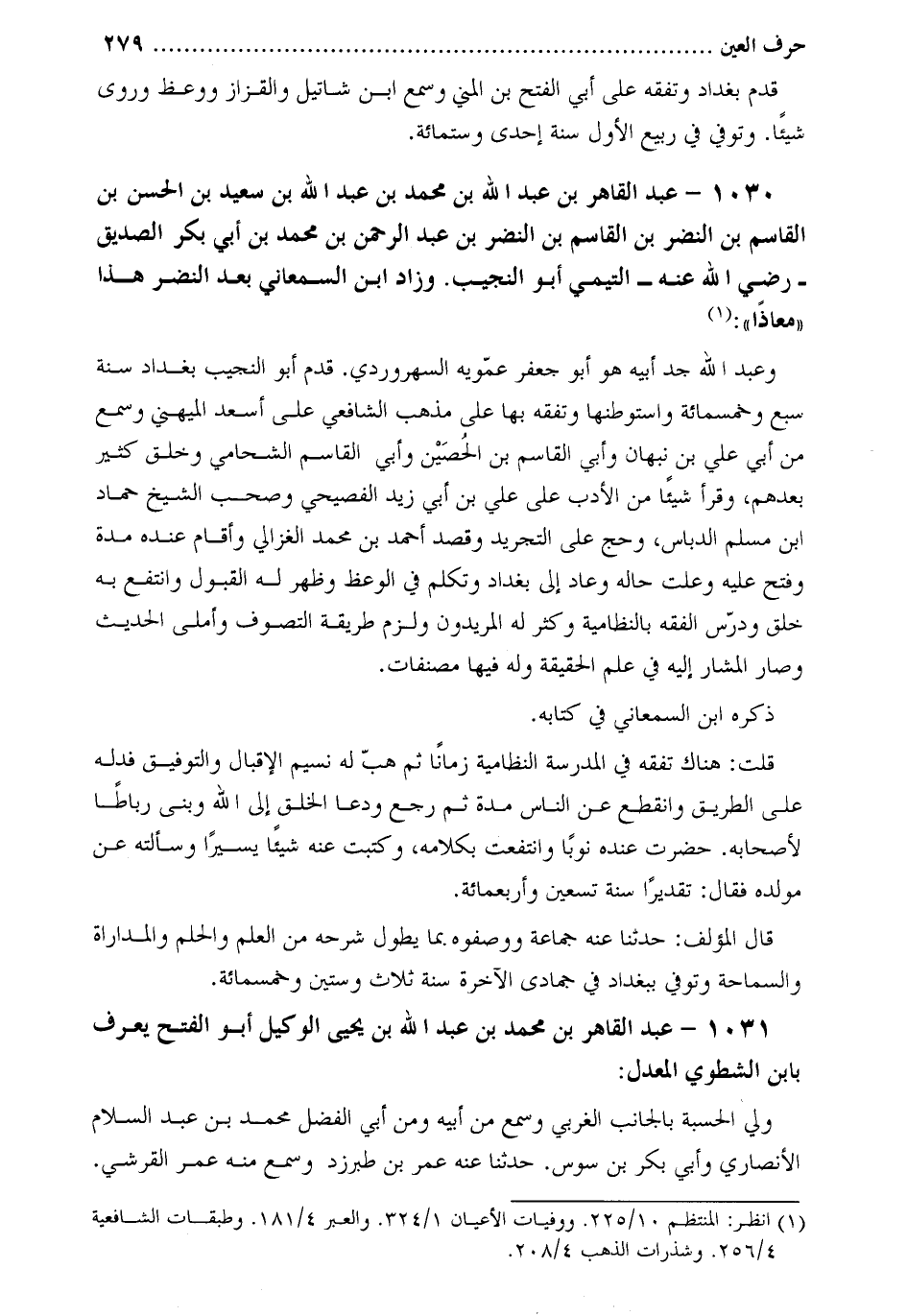 1030- عَبْد القاهر بْن عَبْد اللَّهِ بْن مُحَمَّد بْن عَبْد اللَّه بْن سَعِيد بْن الْحَسَن بن القاسم بن النضر بْن القاسم بْن النضر بْن عَبْد الرَّحْمَن بْن مُحَمَّد بْن أَبِي بَكْر الصديق- رَضِي اللَّهُ عَنْهُ- التيمي أَبُو النجيب. وزاد ابْنُ السمعاني بعد النضْر هَذَا «معاذًا» [1] :