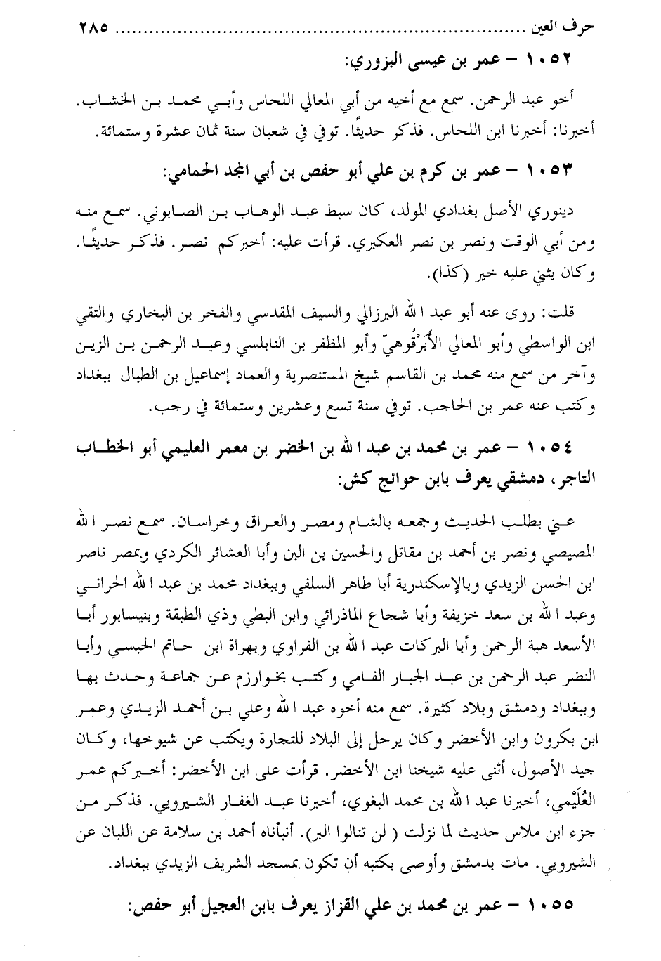 1054- عُمَرُ بْنُ مُحَمَّدِ بْنِ عَبْدِ اللَّهِ بْنِ الخضر بْن معمر العليمي أَبُو الخطاب التاجر، دمشقي يعرف بابن حوائج كش: