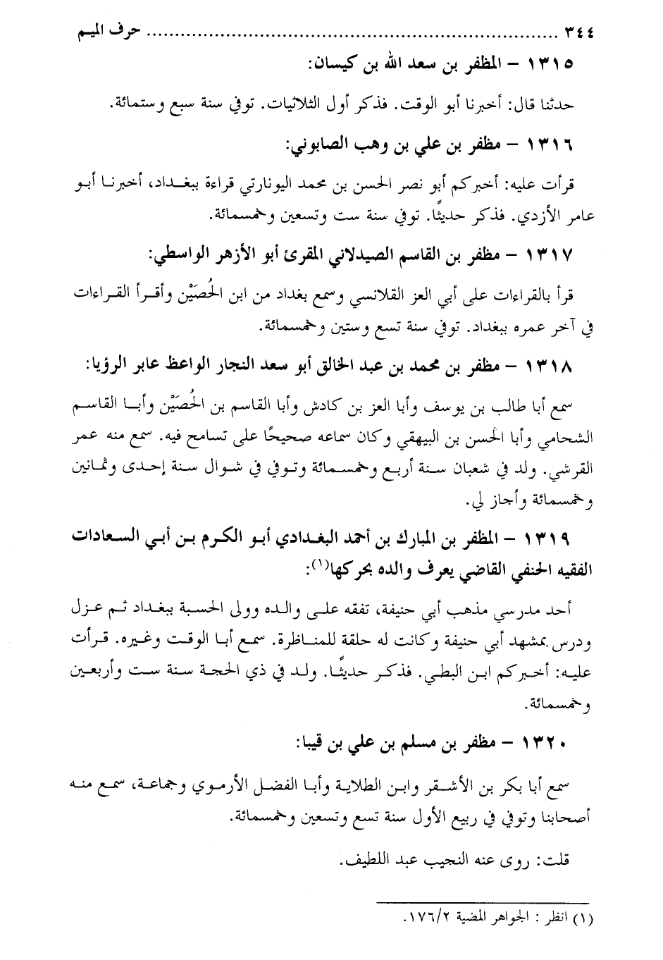1319- المظفر بْن المبارك بْن أَحْمَد البغدادي أَبُو الكرم بْن أَبِي السعادات الفقيه الحنفي القاضي يعرف والده بحركها [1] :