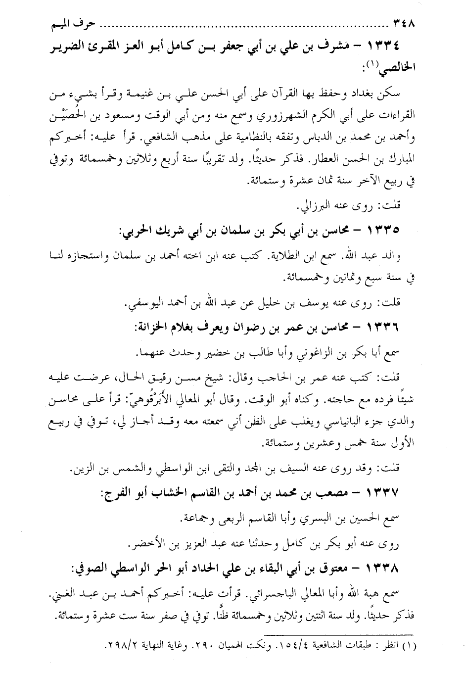 1334- مشرف بْن عليّ بْن أَبِي جَعْفَر بْن كامل أَبُو العز المقرئ الضرير الخالصي [1] :