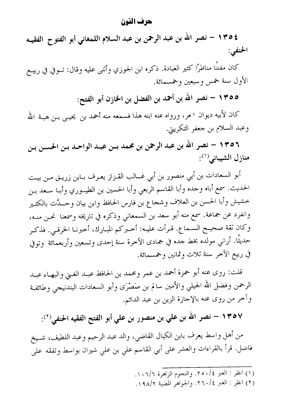 1356- نصر اللَّهِ بْنِ عَبْد الرَّحْمَنِ بْن مُحَمَّدِ بْنِ عَبْد الواحد بْن الْحَسَن بْن منازل الشيباني [1] :