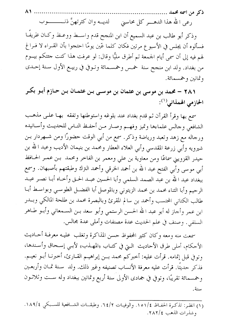 (قلت: سَمِعَ مُحَمَّد بْن معمر، معجم الطبراني الكبير عَلَى فاطمة الجوزدانية وكان جيد المعرفة بمذهب الشَّافعيّ وله معرفة حسنة بالحديث ويد باسطة فِي الأدب وتفنن فِي المعارف والعلوم وَقَدْ حج مَعَ أَبِيهِ فسمع بالكوفة من عُمَر بن إبراهيم الزيدي وبهمذان وبغداد وقدم بغداد غير مرة وحدث بها، وكان ذا مكانة رفيعة عند الدولة وجلالة فِي النفوس وله شعر رائق وسماعه للمعجم حضورًا) .