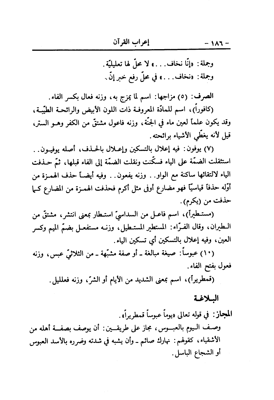زائدة للتقوية «1» ، (نفسه) مجرور لفظا منصوب محلّا مفعول به لاسم الفاعل ظالم.. و (الهاء) مضاف إليه (قال) مثل الأول (ما) نافية (أظنّ) مضارع مرفوع، والفاعل أنا (أن) حرف مصدريّ ونصب (تبيد) مضارع منصوب، (ها) للتنبيه (ذه) اسم إشارة مبنيّ في محلّ رفع فاعل (أبدا) ظرف زمان منصوب متعلّق بفعل تبيد.
