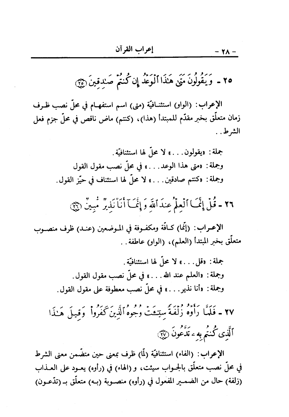 19- (الواو) عاطفة (من أراد) مثل من كان، والفاعل هو (الآخرة) مفعول به منصوب (الواو) عاطفة (سعى) فعل ماض مبنيّ على الفتح المقدّر على الألف، في محلّ جزم معطوف على أراد، والفاعل هو (لها) مثل له متعلّق ب (سعى) ، (سعيها) مفعول مطلق منصوب «1» ، و (الهاء) مضاف إليه (الواو) واو الحال (هو) ضمير منفصل في محلّ رفع مبتدأ (مؤمن) خبر مرفوع (الفاء) رابطة لجواب الشرط (أولئك) اسم إشارة مبنيّ في محلّ رفع مبتدأ..