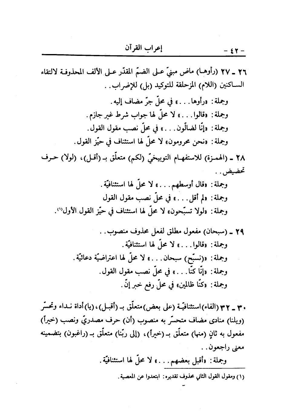 33- (الواو) عاطفة (لا تقتلوا النفس) مثل لا تقتلوا أولادكم (التي) اسم موصول مبنيّ في محلّ نصب نعت للنفس (حرّم) فعل ماض (الله) لفظ الجلالة فاعل مرفوع، والمفعول محذوف أي قتلها (إلّا) أداة حصر (بالحقّ) جارّ ومجرور متعلّق بحال من الفاعل أي متلبّسين بالحقّ «2» ، (الواو) اعتراضيّة (من) اسم شرط جازم مبنيّ في محلّ رفع مبتدأ (قتل) فعل ماض مبنيّ للمجهول، ونائب الفاعل هو (مظلوما) حال منصوبة (الفاء) رابطة لجواب الشرط (قد) حرف تحقيق (جعلنا) فعل ماض وفاعله (لوليّه) جارّ ومجرور متعلّق بمحذوف مفعول به ثان.. و (الهاء) مضاف إليه (سلطانا) مفعول به منصوب (الفاء) رابطة لجواب شرط مقدّر (لا) ناهية جازمة (يسرف) مضارع مجزوم، والفاعل هو (في القتل) جارّ ومجرور متعلّق ب (يسرف) ، (إنّه كان منصورا) مثل إنّه كان..