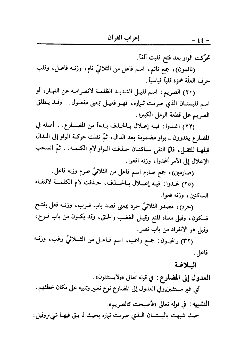 36- (الواو) عاطفة (لا تقف) مثل لا تجعل «1» ، وعلامة الجزم حذف حرف العلّة (ما) اسم موصول مبنيّ في محلّ نصب مفعول به «2» ، (ليس) فعل ماض ناقص جامد (اللام) حرف جرّ و (الكاف) ضمير في محلّ جرّ متعلّق بخبر ليس (الباء) حرف جرّ و (الهاء) ضمير في محلّ جرّ متعلّق بحال من (علم) وهو اسم ليس مؤخّر مرفوع (إنّ) حرف مشبّه بالفعل (السمع) اسم إنّ منصوب (الواو) عاطفة في الموضعين (البصر، الفؤاد) اسمان معطوفان على السمع بحرفي العطف منصوبان (كلّ) مبتدأ مرفوع (أولئك) اسم إشارة مبنيّ في محلّ جرّ مضاف إليه.. و (الكاف) حرف خطاب (كان) ماض ناقص (عنه) مثل به متعلّق ب (مسئولا) وهو خبر كان منصوب.