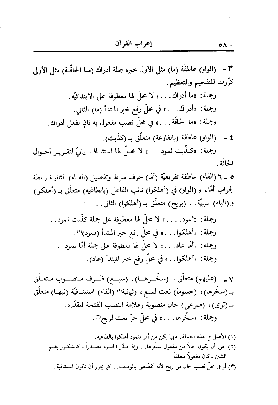 (الواو) عاطفة (إذا ذكرت ربّك) مثل إذا قرأت القرآن.. و (الكاف) مضاف إليه (في القرآن) جارّ ومجرور متعلّق ب (ذكرت) «1» ، (وحده) حال منصوب من ربّك.. و (الهاء) مضاف إليه (ولّوا) مثل ابتغوا «2» ، (على أدبارهم) جارّ ومجرور متعلّق بحال من فاعل ولّوا.. و (هم) مثل الأول (نفورا) مصدر في موضع الحال «3» منصوب.