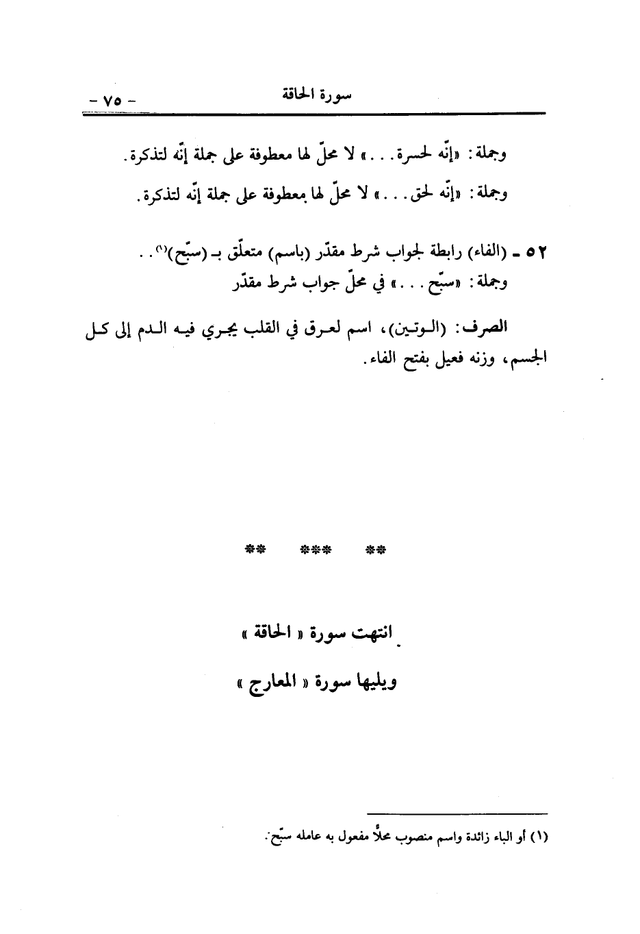 و (الكاف) ضمير مفعول به، (إلا) أداة حصر (فتنة) مفعول به ثان لفعل جعلنا، منصوب (للناس) جارّ ومجرور متعلّق بنعت ل (فتنة) «1» ، (الشجرة) معطوف على الرؤيا بالواو منصوب (الملعونة) نعت للشجرة منصوب (في القرآن) جارّ ومجرور متعلّق ب (الملعونة) (الواو) عاطفة (نخوّفهم) مضارع مرفوع، و (هم) ضمير مفعول به، والفاعل نحن للتعظيم (الفاء) عاطفة (ما) نافية (يزيدهم) مضارع مرفوع، و (هم) مثل الأخير، والفاعل هو أي التخويف (إلّا) مثل الأولى (طغيانا) مفعول به ثان منصوب (كبيرا) نعت ل (طغيانا) منصوب.