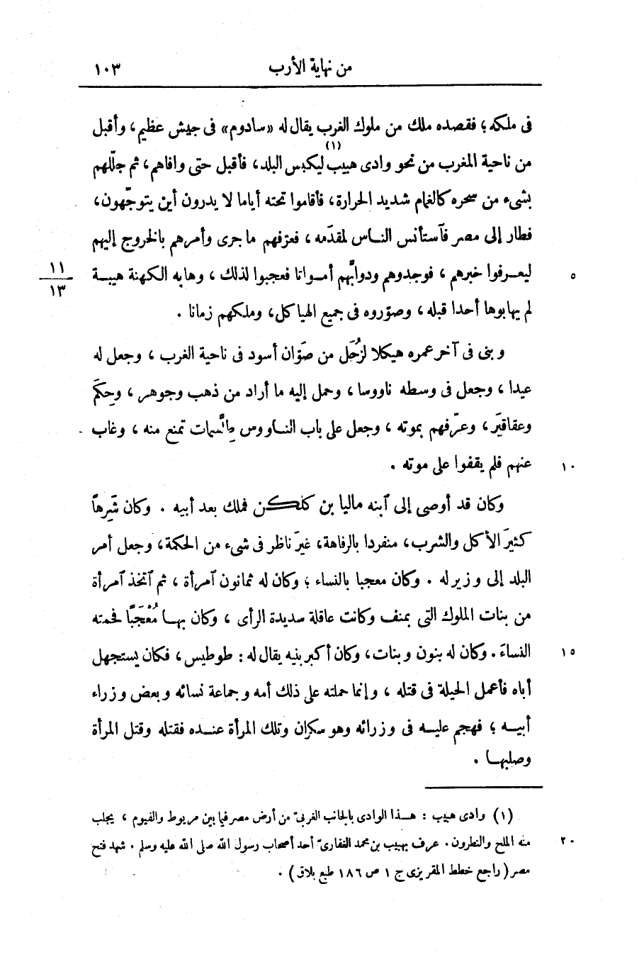 فى ملكه؛ فقصده ملك من ملوك الغرب يقال له «سادوم» فى جيش عظيم، وأقبل من ناحية المغرب من نحو وادى هبيب «1» ليكبس البلد، فأقبل حتى وافاهم، ثم جلّلهم بشىء من سحره كالغمام شديد الحرارة، فأقاموا تحته أياما لا يدرون أين يتوجّهون، فطار إلى مصر فآستأنس الناس لمقدمه، فعرّفهم ما جرى وأمرهم بالخروج إليهم ليعرفوا خبرهم، فوجدوهم ودوابّهم أمواتا فعجبوا لذلك، وهابه الكهنة هيبة لم يهابوها أحدا قبله، وصوّروه فى جميع الهياكل، وملكهم زمانا.