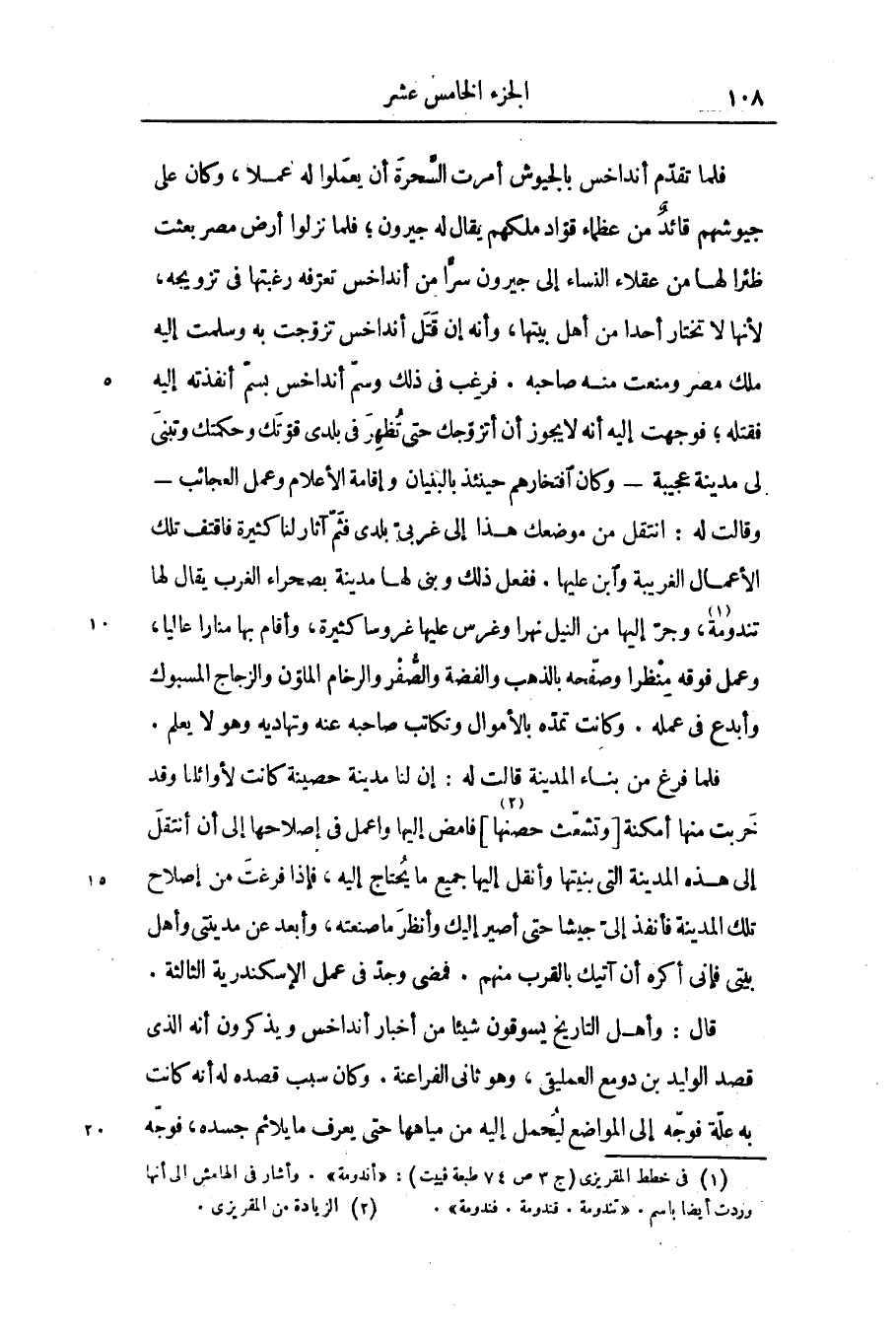 قال: وأهل التاريخ يسوقون شيئا من أخبار أنداخس ويذكرون أنه الذى قصد الوليد بن دومع العمليقى، وهو ثانى الفراعنة. وكان سبب قصده له أنه كانت به علّة فوجّه إلى المواضع ليحمل إليه من مياهها حتى يعرف ما يلائم جسده، فوجّه