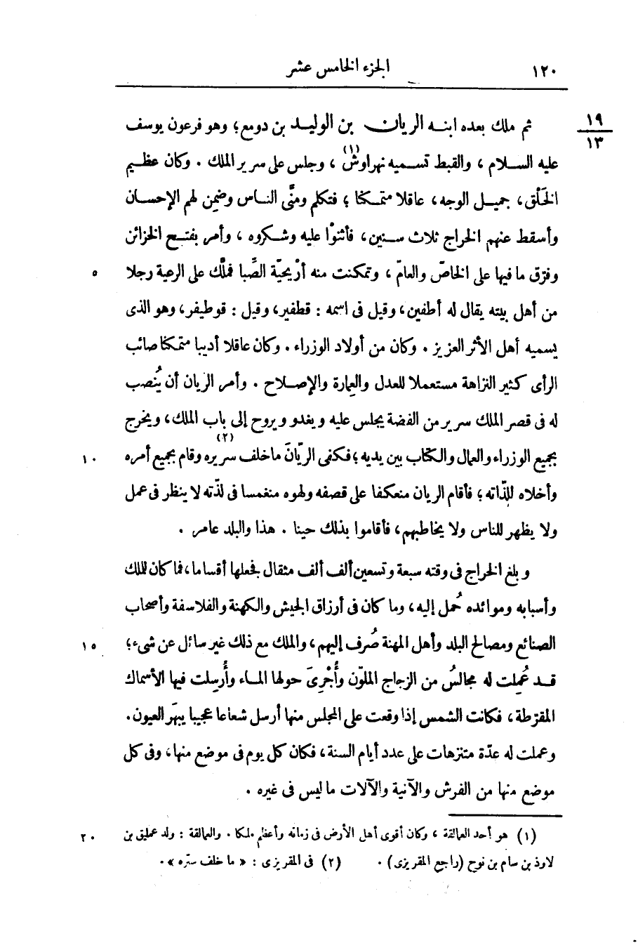 ثم ملك بعده ابنه الريان بن الوليد بن دومع؛ وهو فرعون يوسف عليه السلام، والقبط تسميه نهراوش «1» ، وجلس على سرير الملك. وكان عظيم الخلق، جميل الوجه، عاقلا متمكنا؛ فتكلم ومنّى الناس وضمن لهم الإحسان وأسقط عنهم الخراج ثلاث سنين، فأثنوا عليه وشكروه، وأمر بفتح الخزائن وفرّق ما فيها على الخاصّ والعامّ، وتمكنت منه أريحيّة الصّبا فملّك على الرعية رجلا من أهل بيته يقال له أطفين، وقيل فى اسمه: قطفير، وقيل: قوطيفر، وهو الذى يسميه أهل الأثر العزيز. وكان من أولاد الوزراء. وكان عاقلا أديبا متمكنا صائب الرأى كثير النزاهة مستعملا للعدل والعمارة والإصلاح. وأمر الريان أن ينصب له فى قصر الملك سرير من الفضة يجلس عليه ويغدو ويروح إلى باب الملك، ويخرج بجميع الوزراء والعمال والكتاب بين يديه؛ فكفى الريّان ما خلف سريره «2» وقام بجميع أمره وأخلاه للذّاته؛ فأقام الريان منعكفا على قصفه ولهوه منغمسا فى لذّته لا ينظر فى عمل ولا يظهر للناس ولا يخاطبهم، فأقاموا بذلك حينا. هذا والبلد عامر.