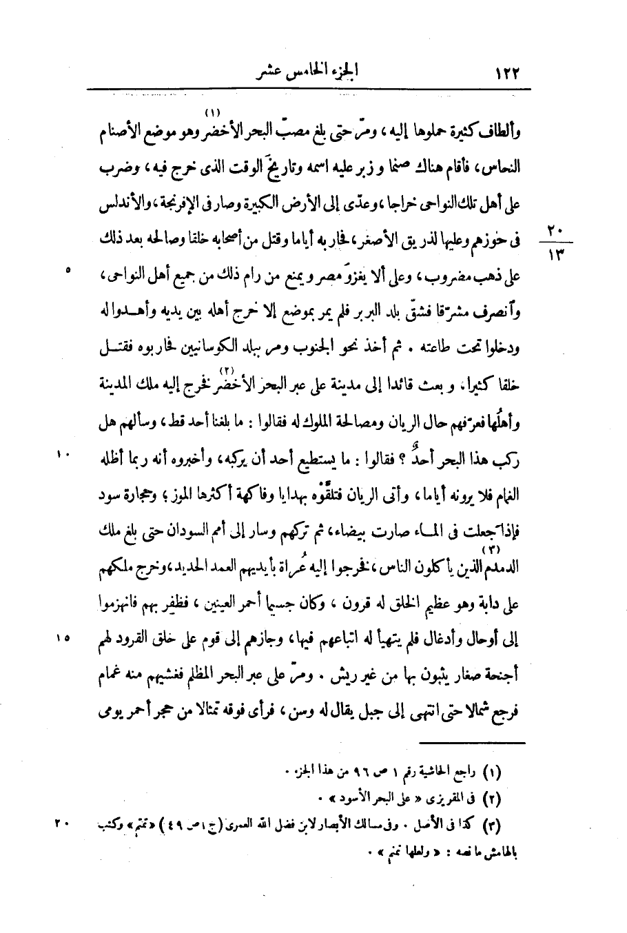 وألطاف كثيرة حملوها إليه، ومرّ حتى بلغ مصبّ البحر الأخضر «1» وهو موضع الأصنام النحاس، فأقام هناك صنما وزبر عليه اسمه وتاريخ الوقت الذى خرج فيه، وضرب على أهل تلك النواحى خراجا، وعدّى إلى الأرض الكبيرة وصار فى الإفرنجة، والأندلس فى حوزهم وعليها لذريق الأصغر، فحاربه أياما وقتل من أصحابه خلقا وصالحه بعد ذلك على ذهب مضروب، وعلى ألا يغزو مصر ويمنع من رام ذلك من جميع أهل النواحى، وانصرف مشرّقا فشقّ بلد البربر فلم يمر بموضع إلا خرج أهله بين يديه وأهدوا له ودخلوا تحت طاعته. ثم أخذ نحو الجنوب ومر ببلد الكوسانيين فحاربوه فقتل خلقا كثيرا، وبعث قائدا إلى مدينة على عبر البحر الأخضر «2» فخرج إليه ملك المدينة وأهلها فعرّفهم حال الريان ومصالحة الملوك له فقالوا: ما بلغنا أحد قط، وسألهم هل ركب هذا البحر أحد؟ فقالوا: ما يستطيع أحد أن يركبه، وأخبروه أنه ربما أظله الغمام فلا يرونه أياما، وأتى الريان فتلقّوه بهدايا وفاكهة أكثرها الموز؛ وحجارة سود فإذا جعلت فى الماء صارت بيضاء، ثم تركهم وسار إلى أمم السودان حتى بلغ ملك الدمدم «3» الذين يأكلون الناس، فخرجوا إليه عراة بأيديهم العمد الحديد، وخرج ملكهم على دابة وهو عظيم الخلق له قرون، وكان جسيما أحمر العينين، فظفر بهم فانهزموا إلى أوحال وأدغال فلم يتهيأ له اتباعهم فيها، وجازهم إلى قوم على خلق القرود لهم أجنحة صغار يثبون بها من غير ريش. ومرّ على عبر البحر المظلم فغشيهم منه غمام فرجع شمالا حتى انتهى إلى جبل يقال له وسن، فرأى فوقه تمثالا من حجر أحمر يومى