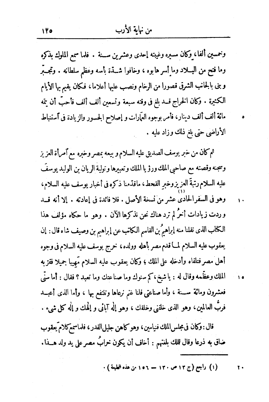 ثم كان من خبر يوسف الصديق عليه السلام وبيعه بمصر وخبره مع امرأة العزيز وسجنه وقصته مع صاحبى الملك ورؤيا الملك وتعبيرها وتولية الريان بن الوليد يوسف عليه السلام رتبة العزيز وخبر القحط، ما قدّمنا ذكره فى أخبار يوسف عليه السلام، وهو فى السفر الحادى «1» عشر من نسخة الأصل. فلا فائدة فى إعادته. إلا أنه قد وردت زيادات أخر لم ترد هناك نحن نذكرها الآن. وهو ما حكاه مؤلف هذا الكتاب الذى نقلنا منه إبراهيم بن القاسم الكاتب عن إبراهيم بن وصيف شاه قال: إن يعقوب عليه السلام لما قدم مصر بأهله وولده، خرج يوسف عليه السلام فى وجوه أهل مصر فتلقاه وأدخله على الملك؛ وكان يعقوب عليه السلام مهيبا جميلا فقرّبه الملك وعظّمه وقال له: يا شيخ، كم سنوك وما صناعتك وما تعبد؟ فقال: أما سنّى فعشرون ومائة سنة، وأما صناعتى فلنا غنم نرعاها وننتفع بها، وأما الذى أعبد فربّ العالمين، وهو الذى خلقنى وخلقك، وهو إله آبائى وإلهك وإله كل شىء.