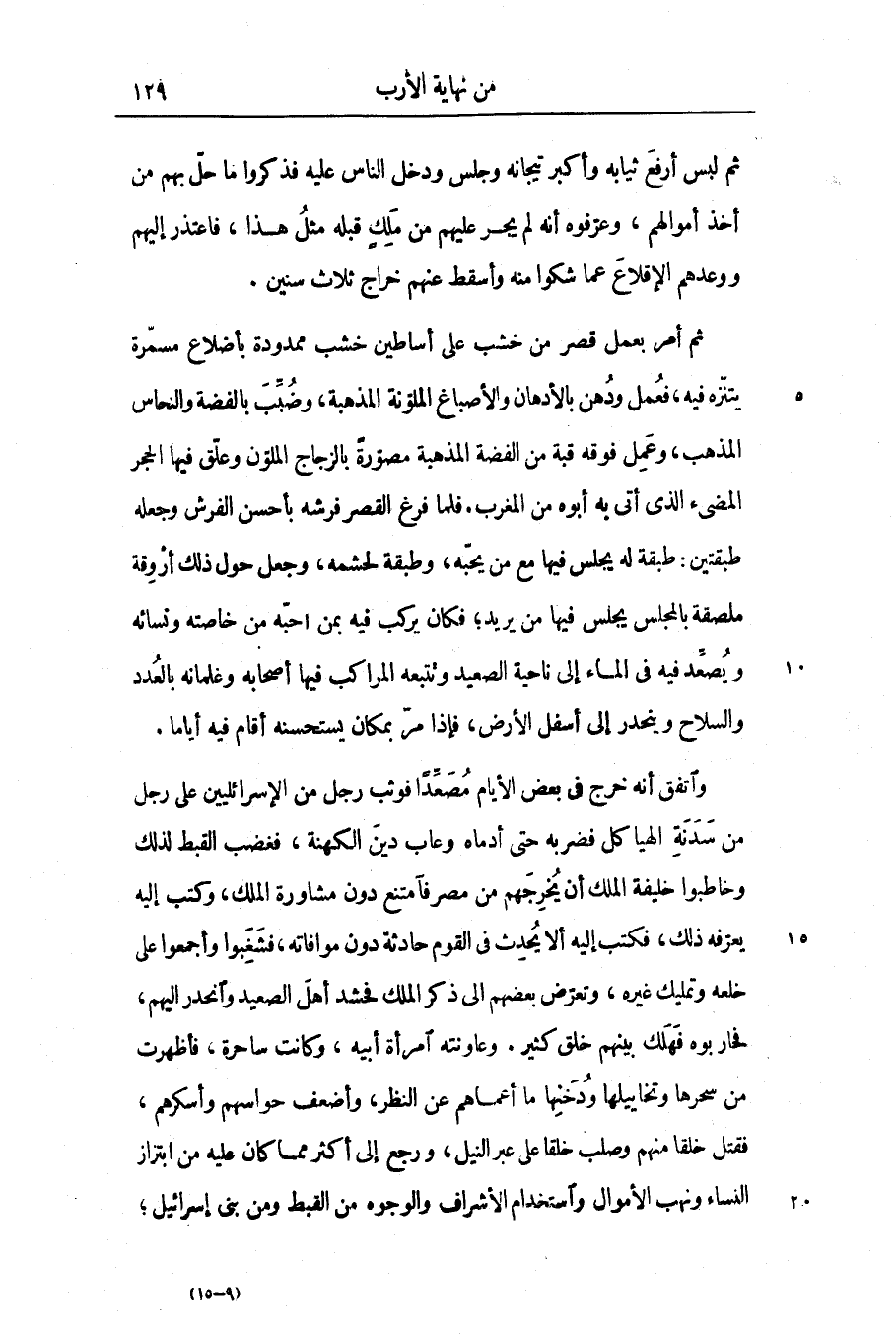 ثم أمر بعمل قصر من خشب على أساطين خشب ممدودة بأضلاع مسمّرة يتنزّه فيه، فعمل ودهن بالأدهان والأصباغ الملوّنة المذهبة، وضبّب بالفضة والنحاس المذهب، وعمل فوقه قبة من الفضة المذهبة مصوّرة بالزجاج الملوّن وعلّق فيها الحجر المضىء الذى أتى به أبوه من المغرب. فلما فرغ القصر فرشه بأحسن الفرش وجعله طبقتين: طبقة له يجلس فيها مع من يحبّه، وطبقة لحشمه، وجعل حول ذلك أروقة ملصقة بالمجلس يجلس فيها من يريد؛ فكان يركب فيه بمن احبّه من خاصته ونسائه ويصعّد فيه فى الماء إلى ناحية الصعيد وتتبعه المراكب فيها أصحابه وغلمانه بالعدد والسلاح وينحدر إلى أسفل الأرض، فإذا مرّ بمكان يستحسنه أقام فيه أياما.