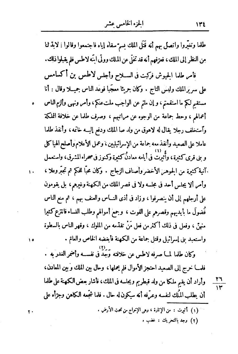 فأمر طلما الجيوش فركبت فى السلاح وأجلس لاطس بن أكسامس على سرير الملك ولبس التاج. وكان جريئا معجبا فوعد الناس جميلا وقال: أنا مستقيم لكم ما استقمتم، وإن ملتم عن الواجب ملت عنكم، وأمر ونهى وألزم الناس أعمالهم، وحط جماعة من الوجوه عن مراتبهم، وصرف طلما عن خلافة المملكة واستخلف رجلا يقال له لاهوق من ولد صا الملك ودفع إليه خاتمه، وأنفذ طلما عاملا على الصعيد وأنفذ معه جماعة من الإسرائيليين، وعمل الأعلام وأصلح الهياكل وبنى قرى كثيرة، وأثيرت «1» فى أيامه معادن كثيرة وكنوز فى صحراء المشرق، واستعمل آنية كثيرة من الجوهر الأخضر وأصناف الزجاج. وكان محبّا للحكم ثم تجبّر وعلا، وأمر ألا يجلس أحد فى مجلسه ولا فى قصر الملك من الكهنة وغيرهم، بل يقومون على أرجلهم إلى أن ينصرفوا، وزاد فى أذى الناس والعنف بهم، ثم منع الناس فضول ما بأيديهم وقصرهم على القوت، وجمع أموالهم وطلب النساء فانتزع كثيرا منهنّ، وفعل فى ذلك أكثر من فعل من تقدّمه من الملوك، وقهر الناس بالسطوة واستعبد بنى إسرائيل وقتل جماعة من الكهنة فأبغضه الخاص والعامّ.