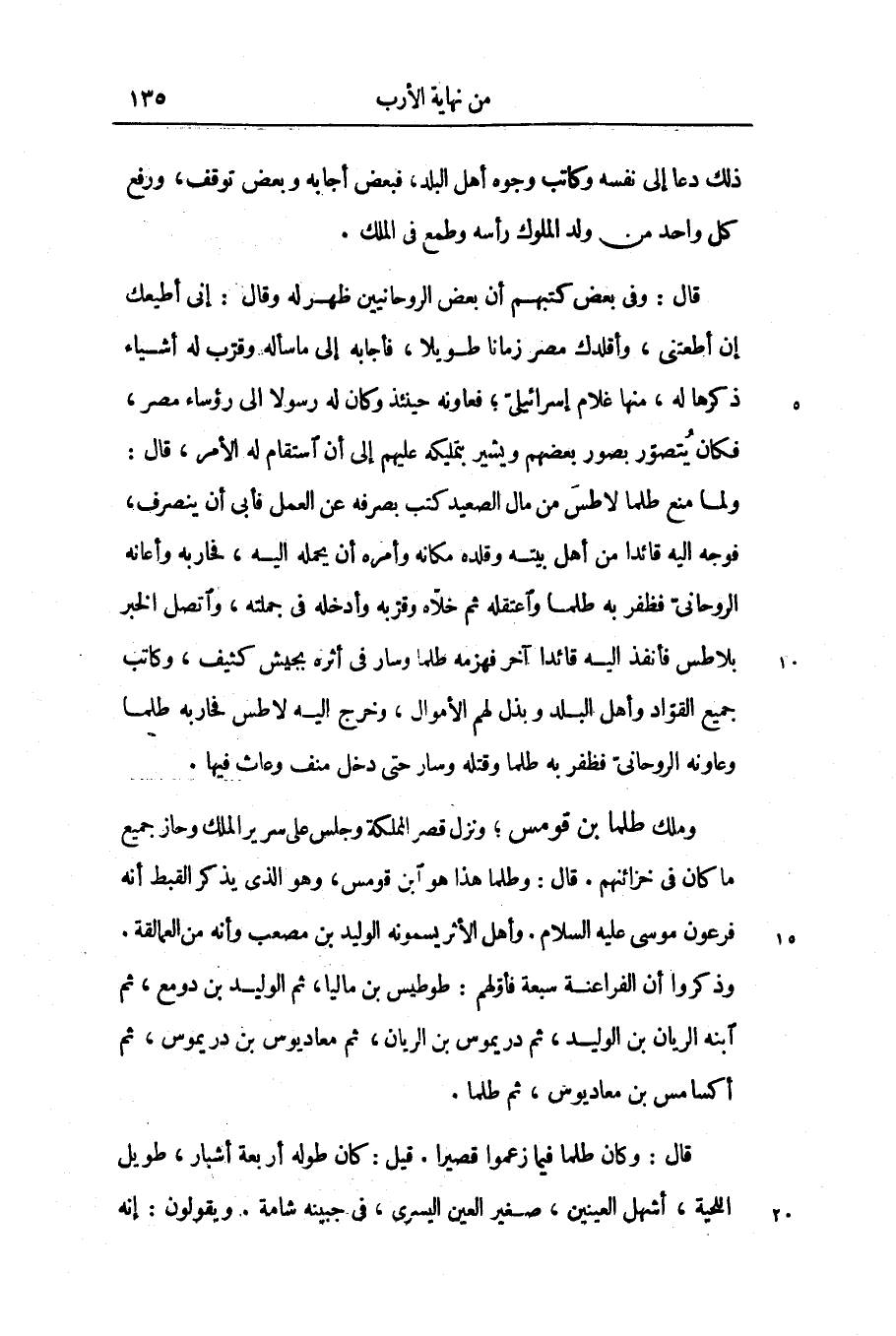 وملك طلما بن قومس؛ ونزل قصر المملكة وجلس على سرير الملك وحاز جميع ما كان فى خزائنهم. قال: وطلما هذا هو ابن قومس، وهو الذى يذكر القبط أنه فرعون موسى عليه السلام. وأهل الأثر يسمونه الوليد بن مصعب وأنه من العمالقة.