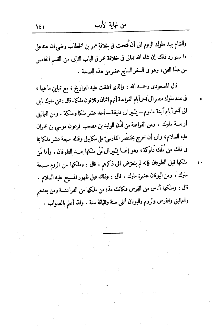 قال المسعودى رحمه الله: والذى اتفقت عليه التواريخ، مع تباين ما فيها، فى عدد ملوك مصر الى آخر أيام الفراعنة أنهم اثنان وثلاثون ملكا. قال: فمن ملوك بابل الى آخر أيام ابنة ماموم- يشير الى دليفة- أحد عشر ملكا وملكة. ومن العماليق أربعة ملوك. ومن الفراعنة من لدن الوليد بن مصعب فرعون موسى بن عمران عليه السلام، والى أن خرج بختنصّر الفارسىّ على مكاييل وقتله سبعة عشر ملكا بما فى ذلك من ملك دلوكة، وهو إنما يشير الى من ملكها بعد الطوفان. وأما من ملكها قبل الطوفان فإنه لم يتعرّض الى ذكرهم. قال: وملكها من الروم سبعة ملوك. ومن اليونان عشرة ملوك. قال: وذلك قبل ظهور المسيح عليه السلام.