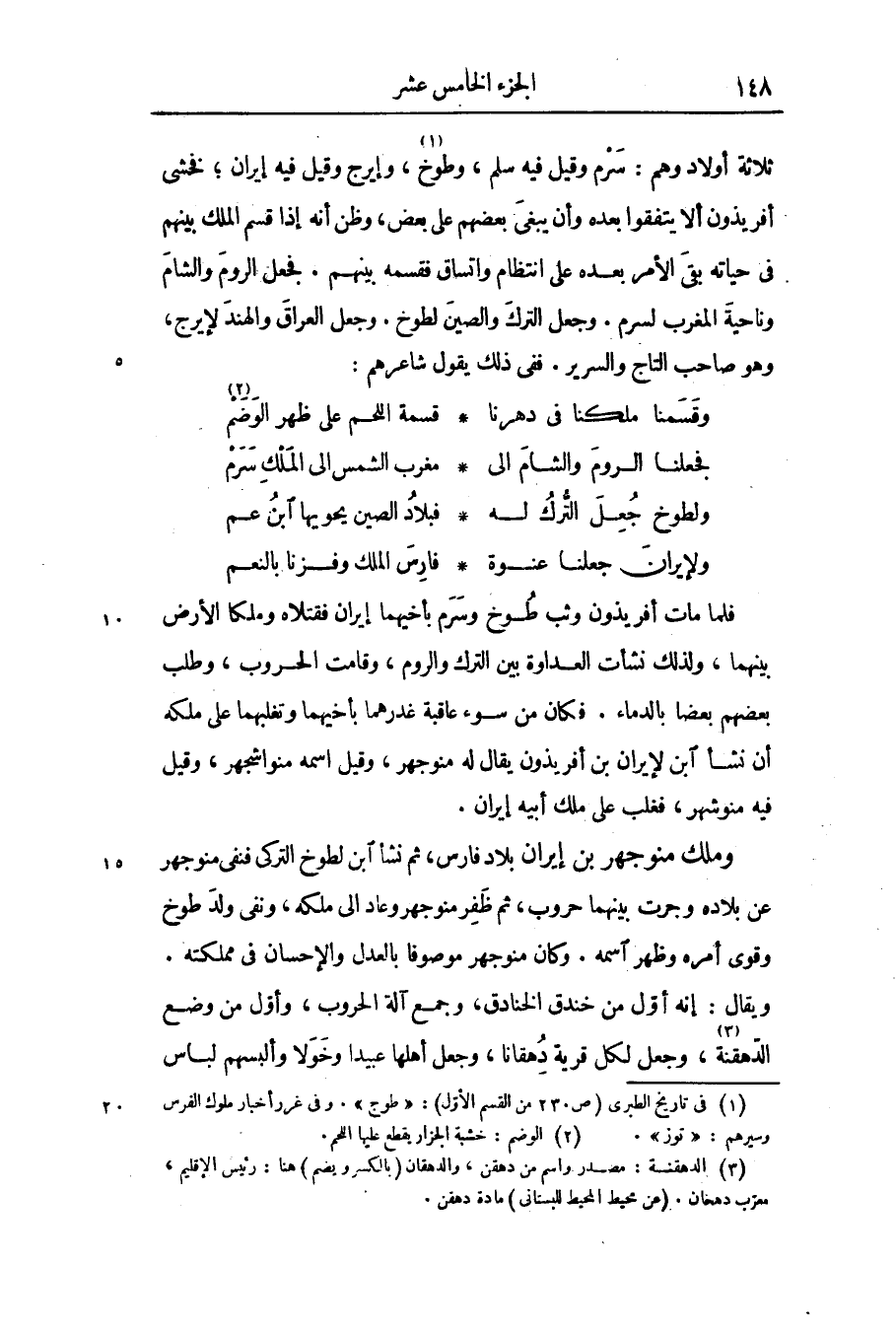 ثلاثة أولادوهم: سرم وقيل فيه سلم، وطوخ «1» ، وإيرج وقيل فيه إيران؛ فخشى أفريذون ألا يتفقوا بعده وأن يبغى بعضهم على بعض، وظن أنه إذا قسم الملك بينهم فى حياته بقى الأمر بعده على انتظام واتساق فقسمه بينهم. فجعل الروم والشام وناحية المغرب لسرم. وجعل الترك والصين لطوخ. وجعل العراق والهند لإيرج، وهو صاحب التاج والسرير. ففى ذلك يقول شاعرهم: