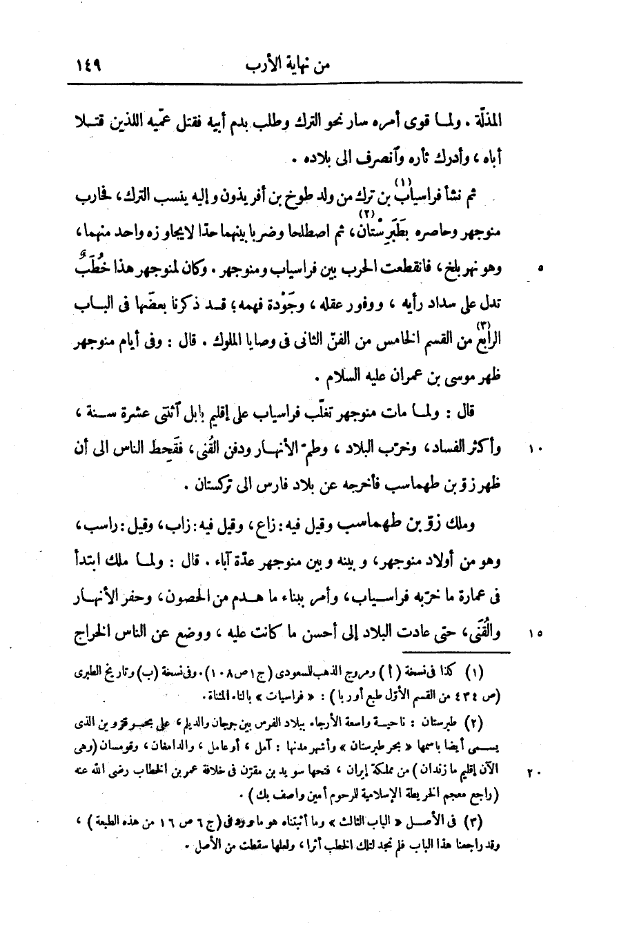 ثم نشأ فراسياب «1» بن ترك من ولد طوخ بن أفريذون وإليه ينسب الترك، فحارب منوجهر وحاصره بطبرستان «2» ، ثم اصطلحا وضربا بينهما حدّا لا يجاوزه واحد منهما، وهو نهر بلخ، فانقطعت الحرب بين فراسياب ومنوجهر. وكان لمنوجهر هذا خطب تدل على سداد رأيه، ووفور عقله، وجودة فهمه؛ قد ذكرنا بعضها فى الباب الرابع «3» من القسم الخامس من الفنّ الثانى فى وصايا الملوك. قال: وفى أيام منوجهر ظهر موسى بن عمران عليه السلام.