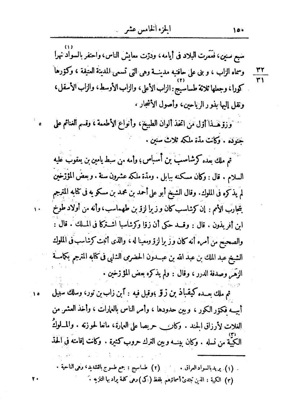 ثم ملك بعده كرشاسب بن أسباس؛ وأمه من سبط يامين بن يعقوب عليه السلام. قال: وكان مسكنه ببابل. ومدّة ملكه عشرون سنة. وبعض المؤرّخين لم يذكره فى الملوك. وقال الشيخ أبو على أحمد بن محمد بن مسكويه فى كتابه المترجم بتجارب الأمم: إن كرشاسب كان وزيرا لزوّ بن طهماسب، وأنه من أولاد طوخ ابن أفريذون. قال: وقد حكى أن زوّا وكرشاسبا اشتركا فى الملك. قال: