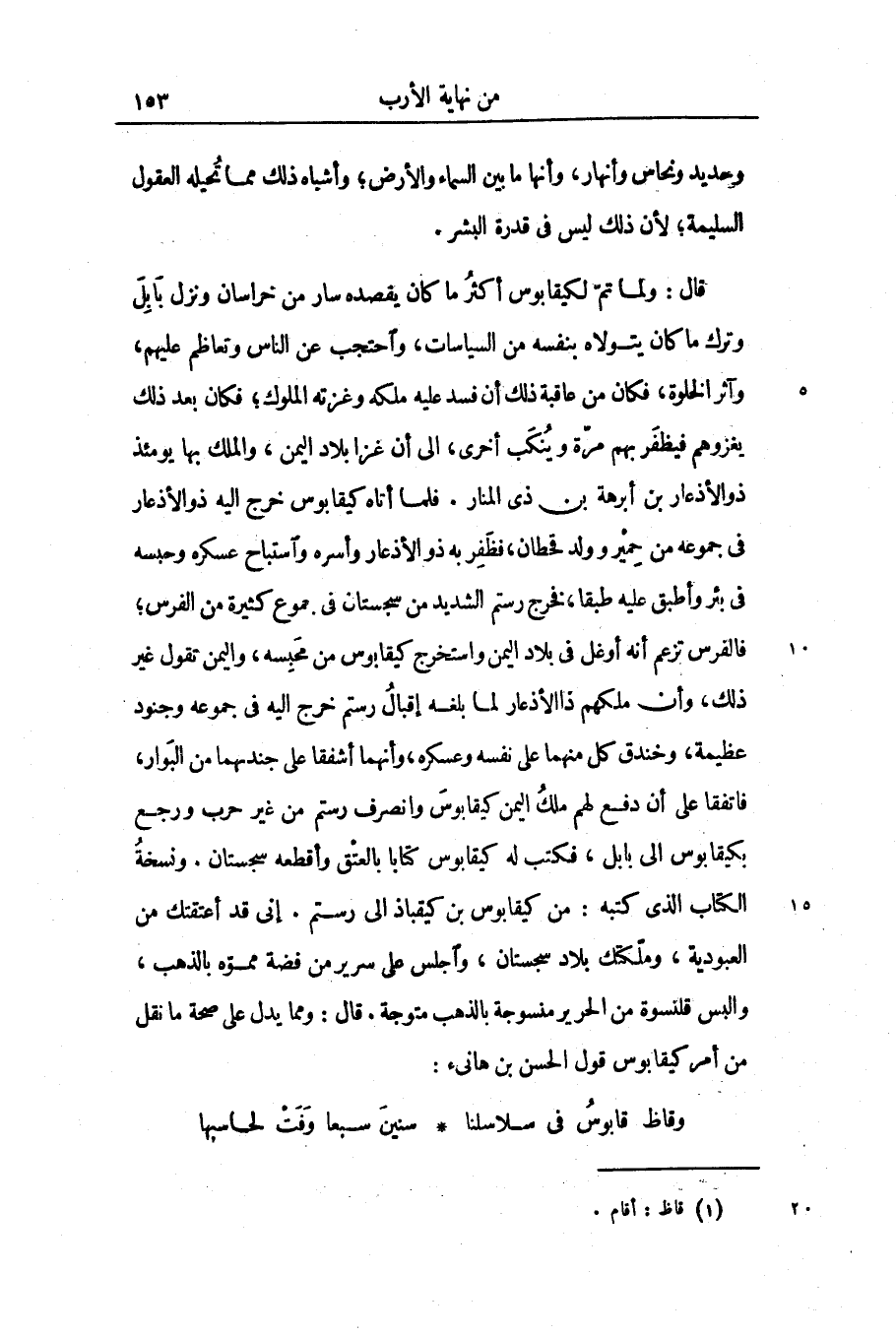 قال: ولما تمّ لكيقابوس أكثر ما كان يقصده سار من خراسان ونزل بابل وترك ما كان يتولاه بنفسه من السياسات، واحتجب عن الناس وتعاظم عليهم، وآثر الخلوة، فكان من عاقبة ذلك أن فسد عليه ملكه وغزته الملوك؛ فكان بعد ذلك يغزوهم فيظفر بهم مرّة وينكب أخرى، الى أن غزا بلاد اليمن، والملك بها يومئذ ذو الأذعار بن أبرهة بن ذى المنار. فلما أتاه كيقابوس خرج اليه ذو الأذعار فى جموعه من حمير وولد قحطان، فظفر به ذو الأذعار وأسره واستباح عسكره وحبسه فى بئر وأطبق عليه طبقا، فخرج رستم الشديد من سجستان فى جموع كثيرة من الفرس؛ فالفرس تزعم أنه أوغل فى بلاد اليمن واستخرج كيقابوس من محبسه، واليمن تقول غير ذلك، وأن ملكهم ذاالأذعار لما بلغه إقبال رستم خرج اليه فى جموعه وجنود عظيمة، وخندق كل منهما على نفسه وعسكره، وأنهما أشفقا على جندهما من البوار، فاتفقا على أن دفع لهم ملك اليمن كيقابوس وانصرف رستم من غير حرب ورجع بكيقابوس الى بابل، فكتب له كيقابوس كتابا بالعتق وأقطعه سجستان. ونسخة الكتاب الذى كتبه: من كيقابوس بن كيقباذ الى رستم. إنى قد أعتقتك من العبودية، وملّكتك بلاد سجستان، واجلس على سرير من فضة مموّه بالذهب، والبس قلنسوة من الحرير منسوجة بالذهب متوجة. قال: ومما يدل على صحة ما نقل من أمر كيقابوس قول الحسن بن هانىء: