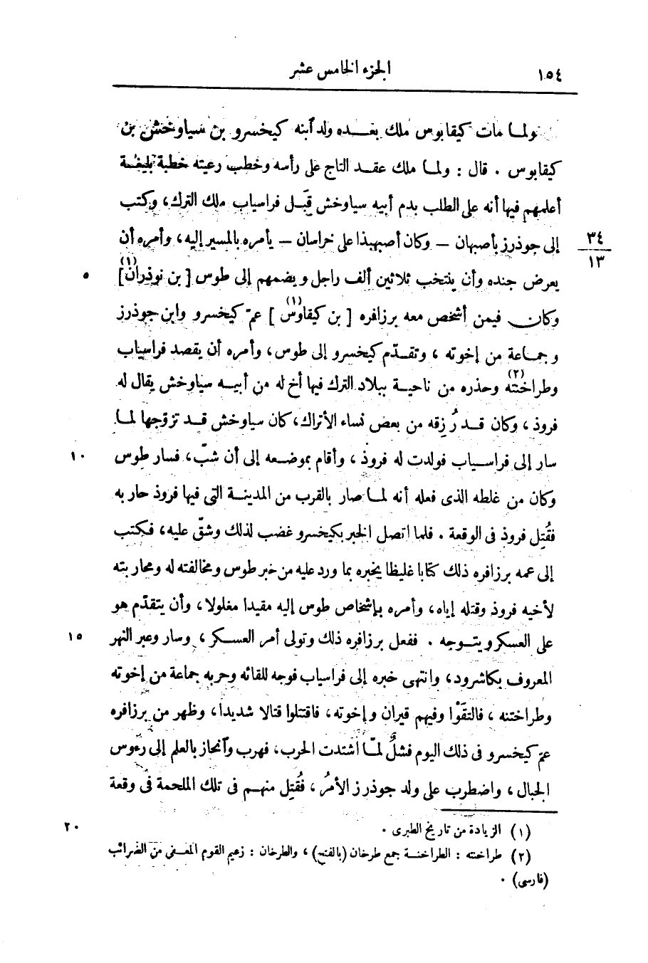 ولما مات كيقابوس ملك بعده ولد ابنه كيخسرو بن سياوخش بن كيقابوس. قال: ولما ملك عقد التاج على رأسه وخطب رعيته خطبة بليغة أعلمهم فيها أنه على الطلب بدم أبيه سياوخش قبل فراسياب ملك الترك، وكتب إلى جوذرز بأصبهان- وكان أصبهبذا على خراسان- يأمره بالمسير إليه، وأمره أن يعرض جنده وأن ينتخب ثلاثين ألف راجل ويضمهم إلى طوس [بن نوذران «1» ] وكان فيمن أشخص معه برزافره [بن كيقاوس «2» ] عمّ كيخسرو وابن جوذرز وجماعة من إخوته، وتقدّم كيخسرو إلى طوس، وأمره أن يقصد فراسياب وطراخنته «3» وحذره من ناحية ببلاد الترك فيها أخ له من أبيه سياوخش يقال له فروذ، وكان قد رزقه من بعض نساء الأتراك، كان سياوخش قد تزوّجها لما سار إلى فراسياب فولدت له فروذ، وأقام بموضعه إلى أن شبّ، فسار طوس وكان من غلطه الذى فعله أنه لما صار بالقرب من المدينة التى فيها فروذ حاربه فقتل فروذ فى الوقعة. فلما اتصل الخبر بكيخسرو غضب لذلك وشقّ عليه، فكتب إلى عمه برزافره ذلك كتابا غليظا يخبره بما ورد عليه من خبر طوس ومخالفته له ومحاربته لأخيه فروذ وقتله إياه، وأمره بإشخاص طوس إليه مقيدا مغلولا، وأن يتقدّم هو على العسكر ويتوجه. ففعل برزافره ذلك وتولى أمر العسكر، وسار وعبر النهر المعروف بكاشرود، وانتهى خبره إلى فراسياب فوجه للقائه وحربه جماعة من إخوته وطراختنه، فالتقوا وفيهم قيران وإخوته، فاقتتلوا قتالا شديدا، وظهر من برزافره عمّ كيخسرو فى ذلك اليوم فشل لمّا اشتدت الحرب، فهرب وانحاز بالعلم إلى رءوس الجبال، واضطرب على ولد جوذرز الأمر، فقتل منهم فى تلك الملحمة فى وقعة